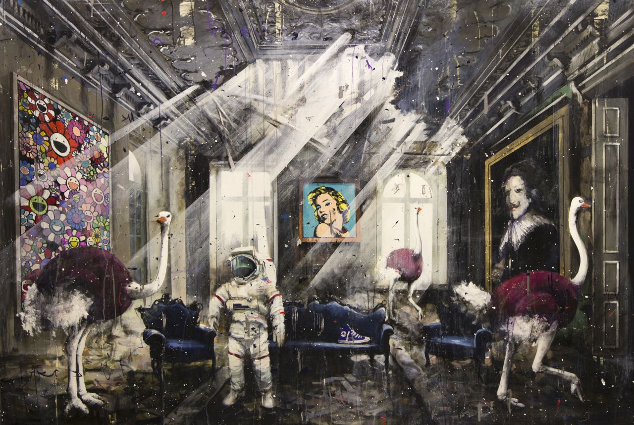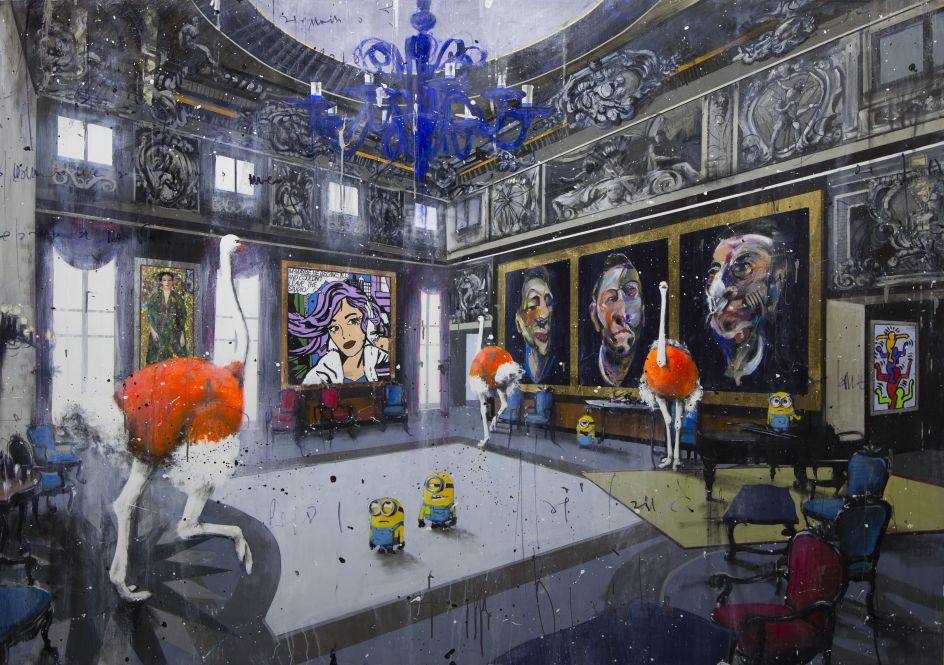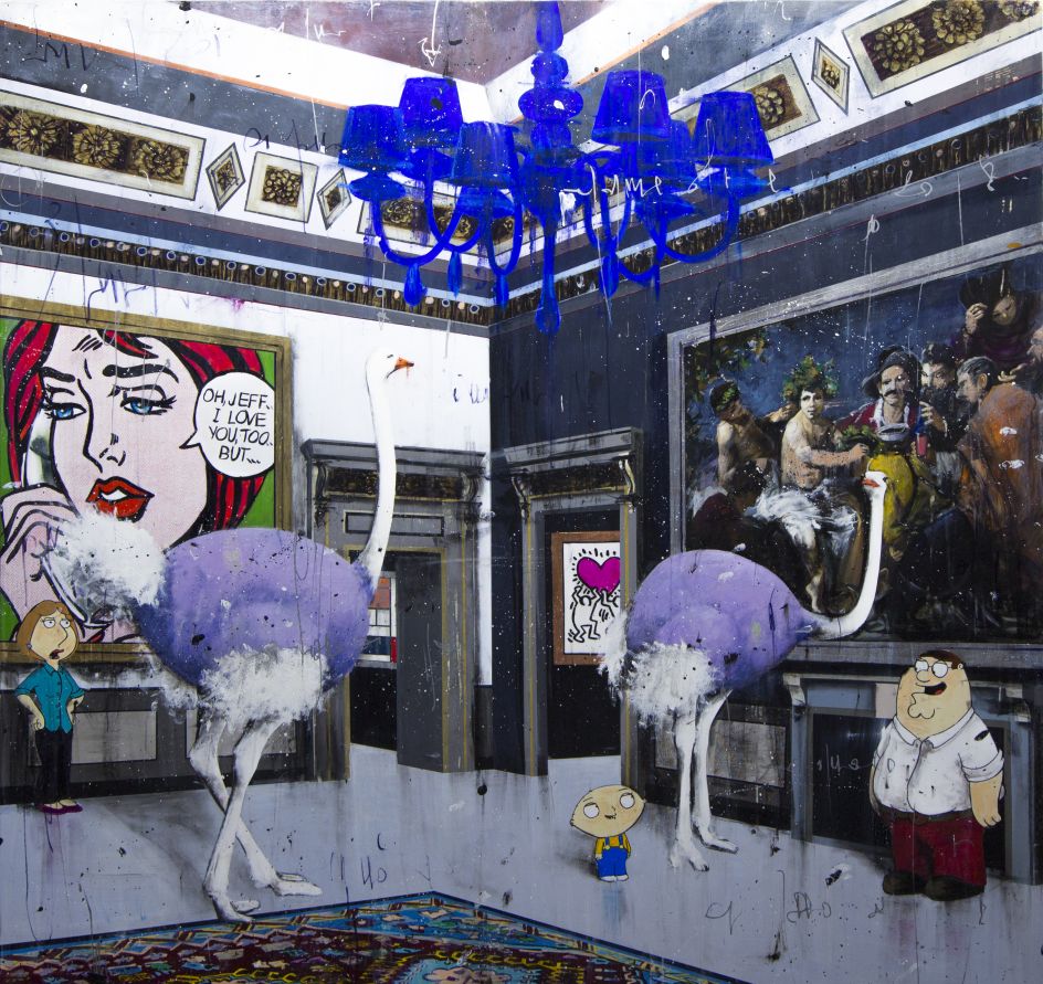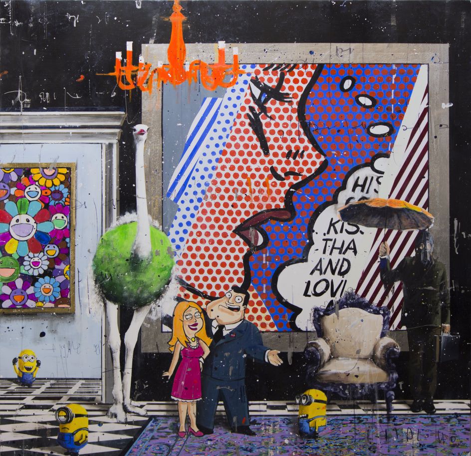 Using contrasting references to create ‘opposite poles’ his images use repeated presences of contemporary pop characters linked to mass culture, such as minions, and characters from American Dad! and Family Guy - alongside classical artistic styles.