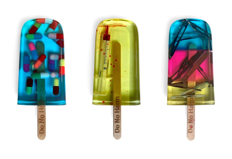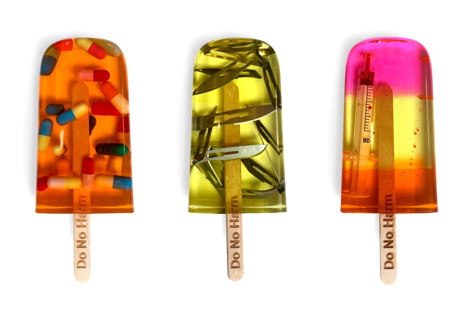 Each lolly is created using three layers of different coloured resin, containing a mix of surgical blades, Viagra, syringes and various painkillers.