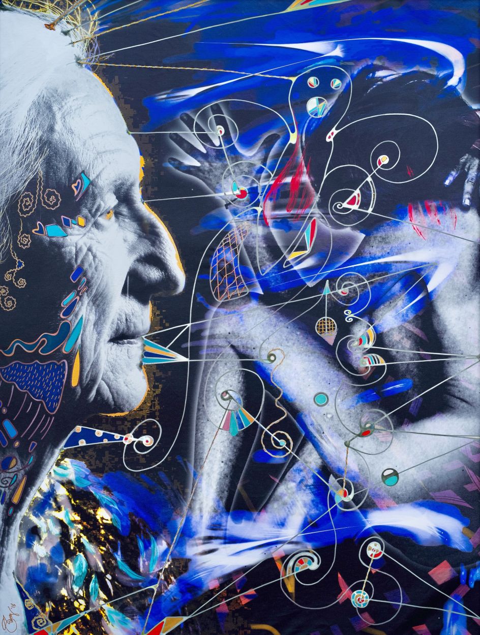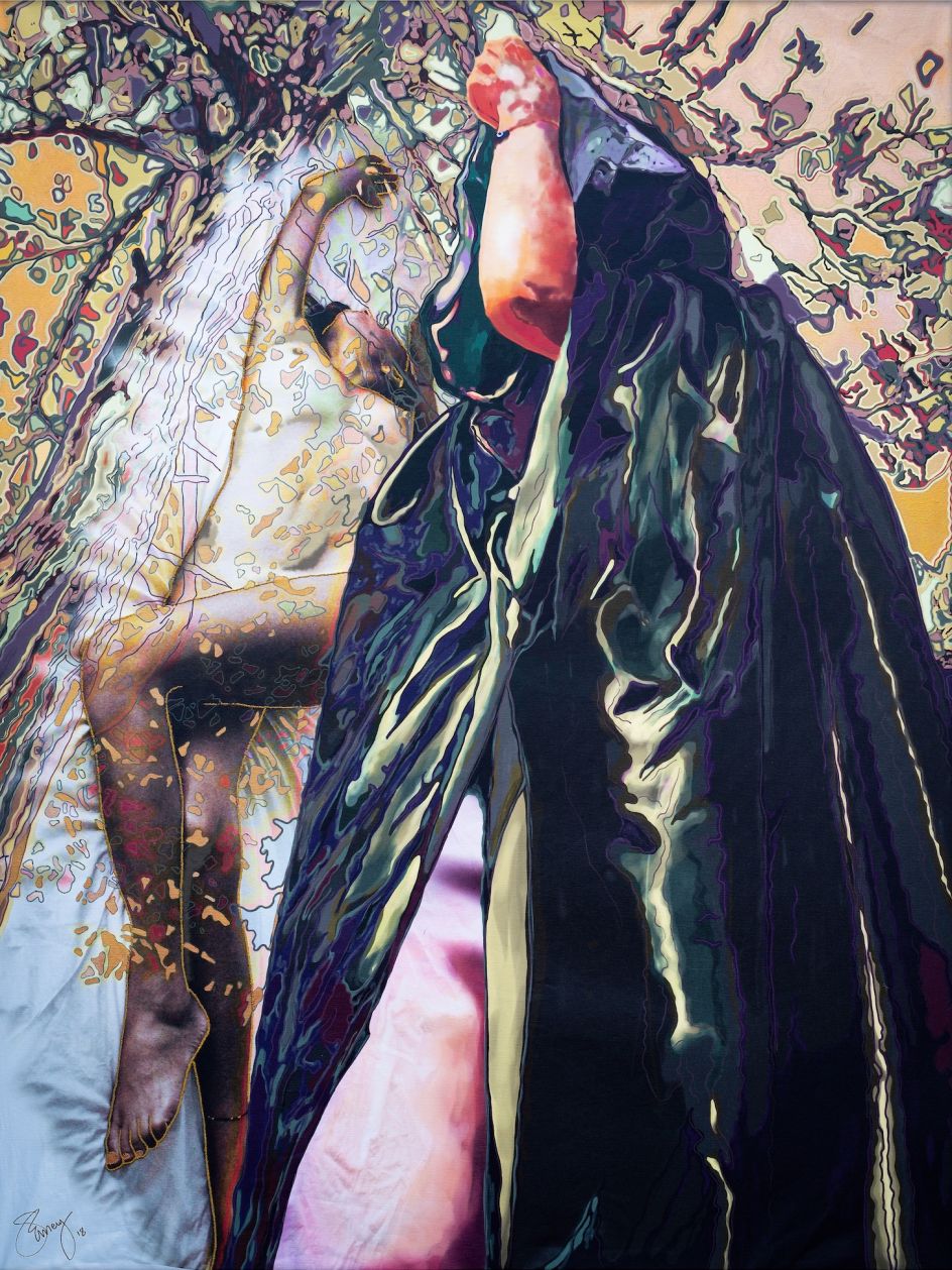 Each piece – made over exactly nine months—was created using digital drawing, photo compositing, embroidery and painting. Emery digitally printed each image, beforehand embroidering them with silver, copper and golden thread, then applying acrylic paint before stretching the canvas with stainless steel cable wire onto custom-made frames. The idea is that the final stretched piece resembles a skin and a way in which the artist can get under the skin of those women she’s depicting.