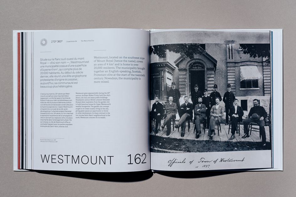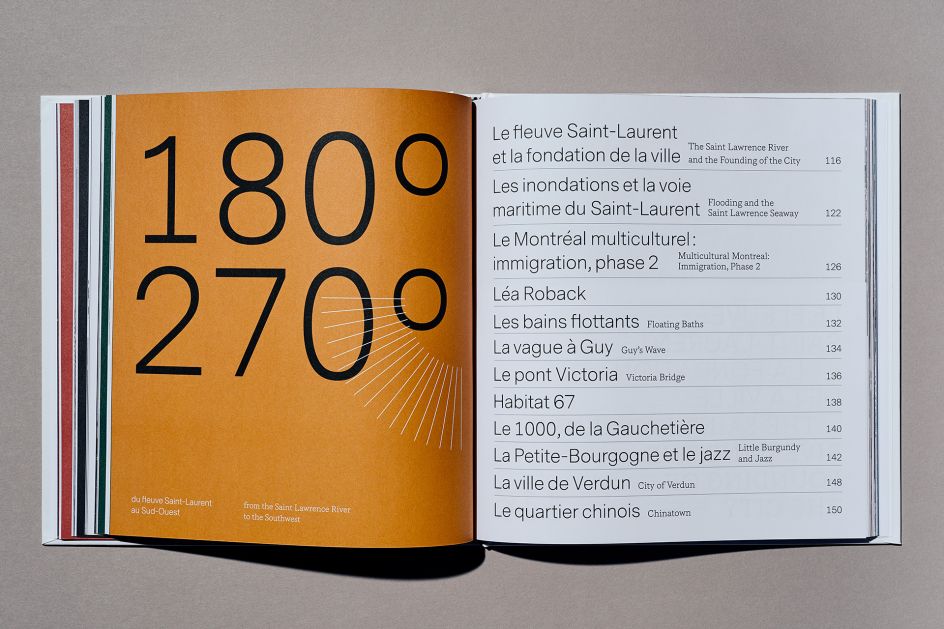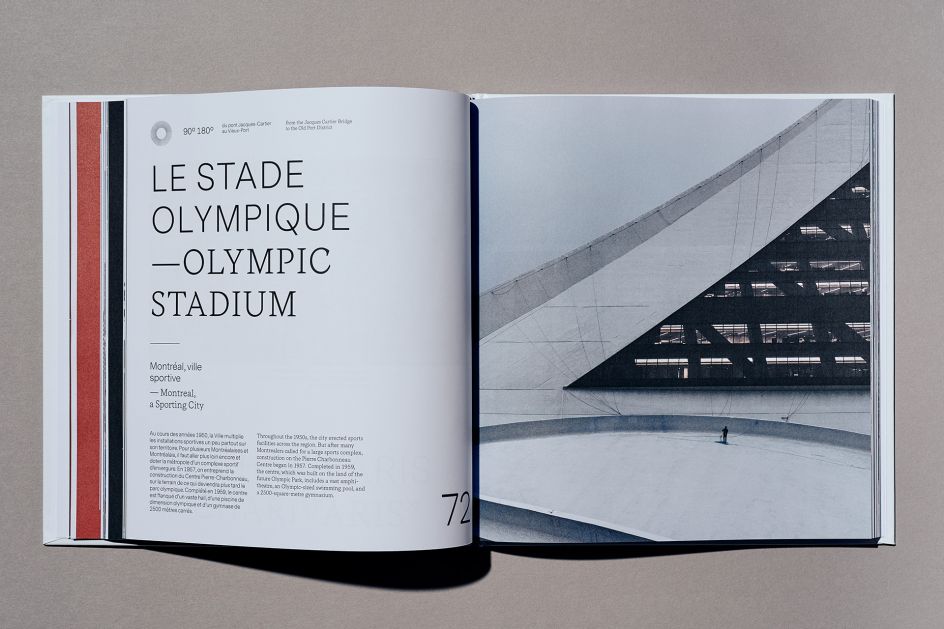 The studio worked with the Observatory of Ville-Marie Tower, a unique point of view in Montreal where you have a 360-degree view of the city, on a new 192-page historical book titled Montreal 360°. The book is aimed at tourists as a memento of their time in the city; and as such, the designers chose a square format to create a piece that was "not too big nor too heavy" to take home.