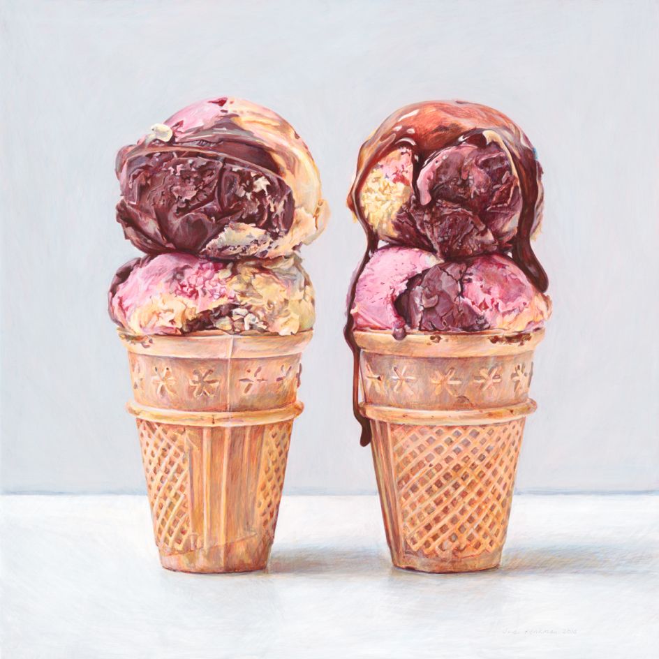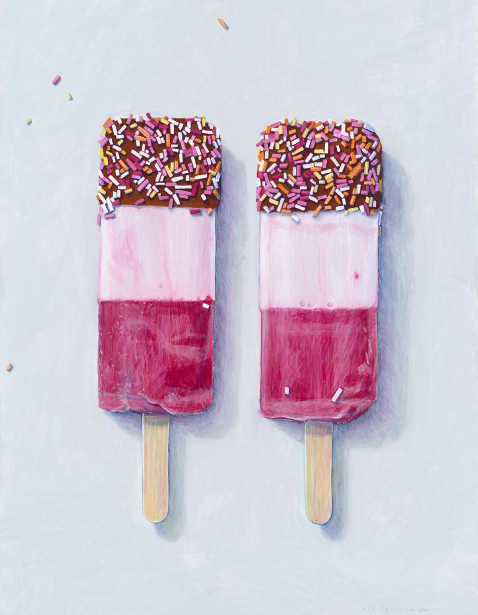UK-based New Zealander Joël Penkman is someone who loves to paint as much as she loves to eat. So when she considered the subject of her own artworks, she naturally combined the two and began to create simple still-life compositions of some of her favourite snacks and treats. Think everything from ice lollies, party food and hotdogs to treacle tins, Monster Munch and pork pies.