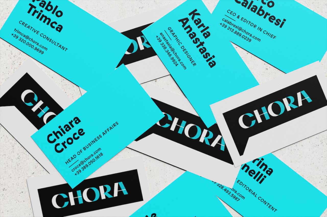 Chora's ability to bring a new perspective to a story results in letterforms that can seemingly be seen from multiple angles. Mucca also chose a speech bubble container to denote the idea of Chora as a platform that amplifies voices.