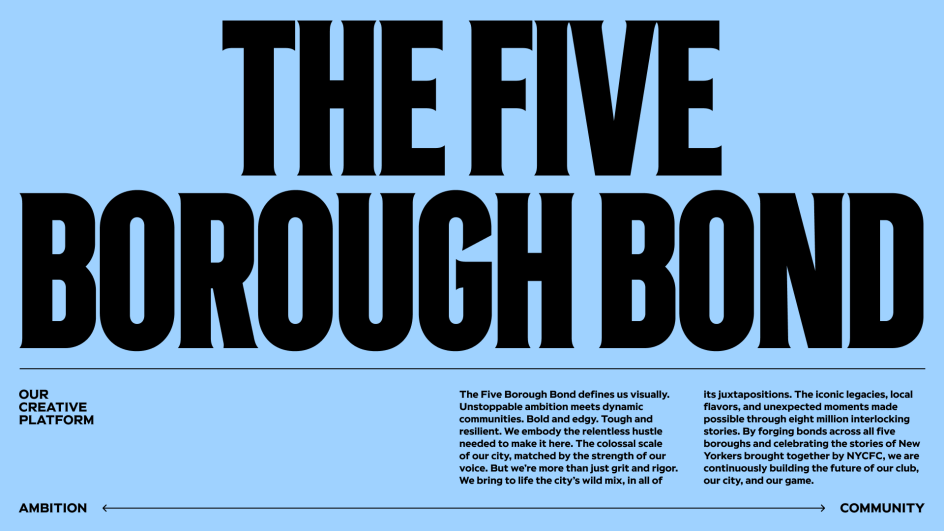 Involving the community across all five boroughs was the key to making this work. "In addition to market research, several focus groups were held with NYCFC super-fans to discuss what matters to them and what about the club identity they hold near and dear," says Reagon.