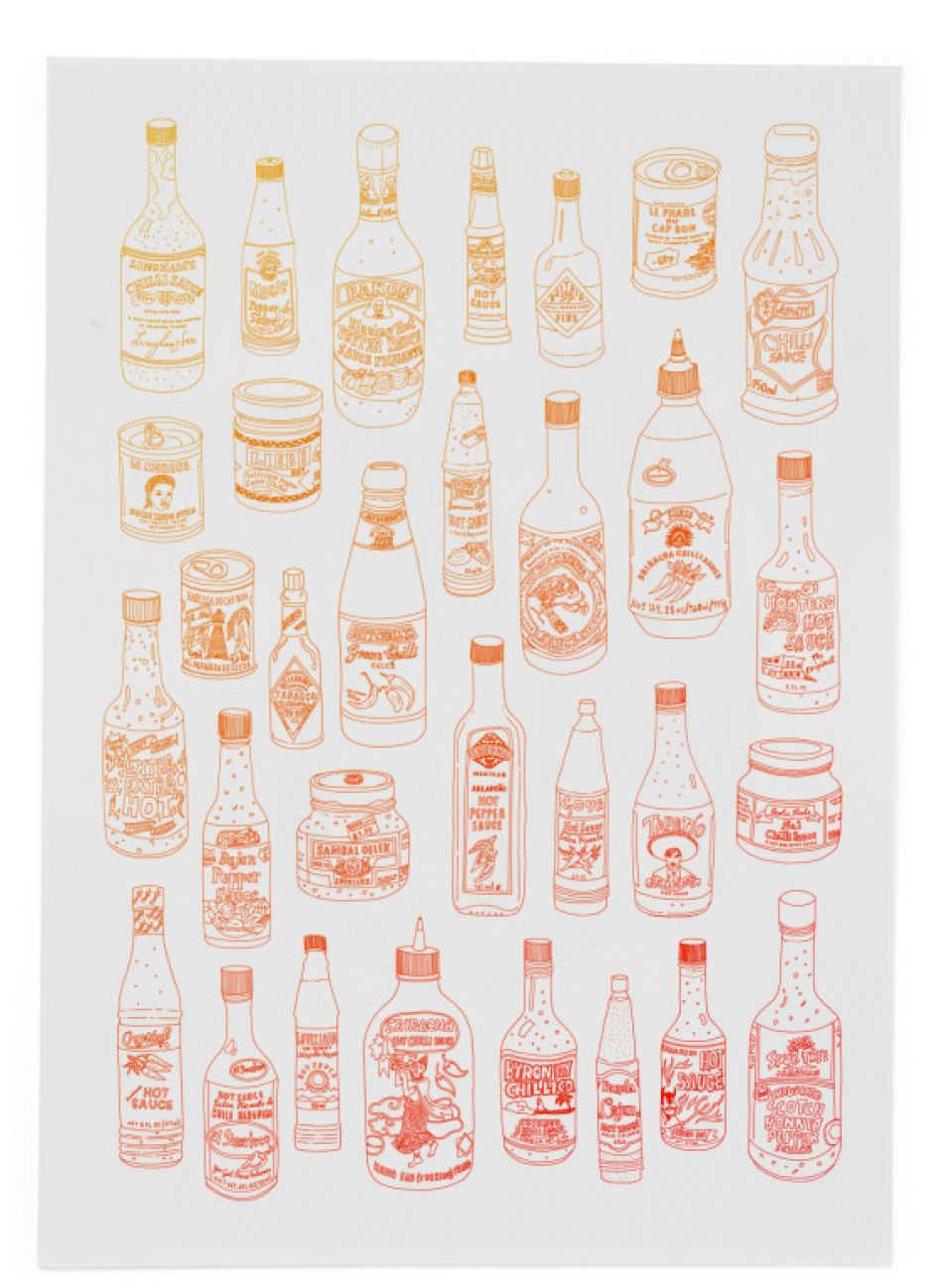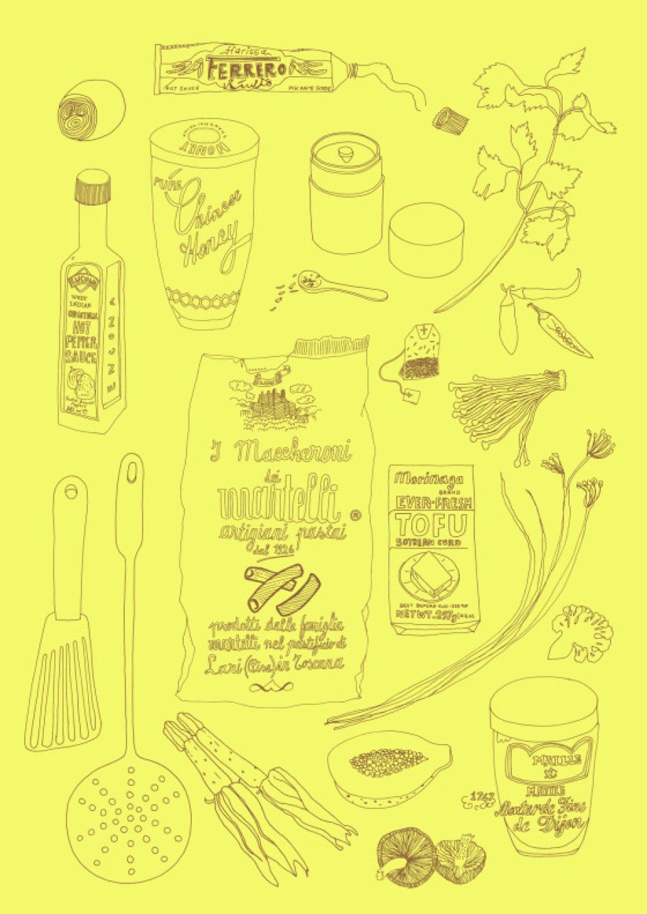 There’s something so charming and whimsical about the work of London-based Nina Chakrabarti. She manages to find something special in the most apparently mundane little things in life, and creates gorgeous smorgasbords of objects from plants to a range of hot sauces to shoes, cups and kitchen utensils. There’s a lovely sense of freedom in her lifework, and the way she uses just a single colour against a striking, bright background really makes the work pop.