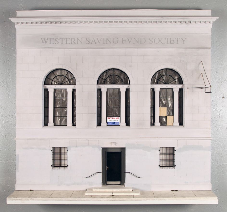 The minute attention to detail includes city detritus such as dumpsters and pallets, which are a commentary of the same ideas of what is worth preserving. Highlighting quick fixes and simple solutions, Leshko’s work begs the viewer to build their own ideas of why and when these changes had been made. Accumulations of typically overlooked details and minutiae like acid rain deposits and rust become beautiful adornments.