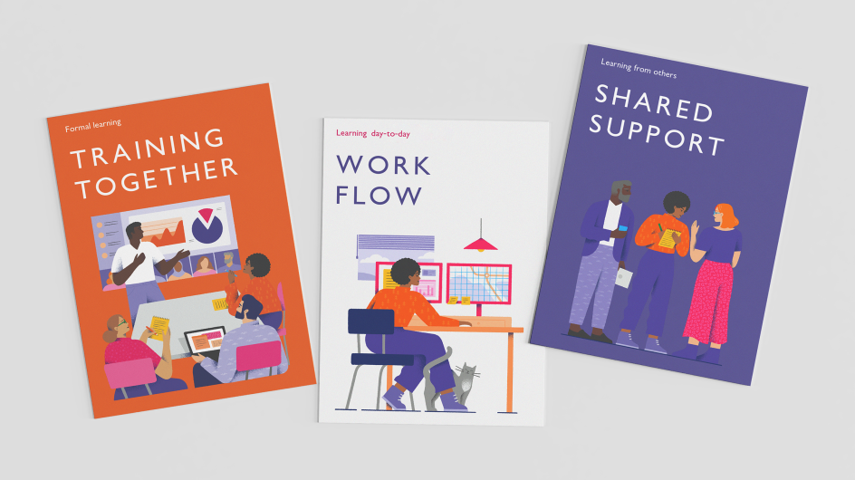 The patterns show up in illustrations, too. Lark commissioned illustrator Nicola Robson to create a series of bespoke illustrations centred around people and representing the services offered by the Learning and Development team.