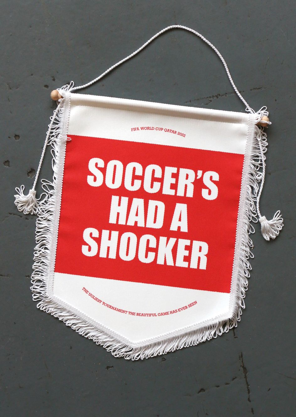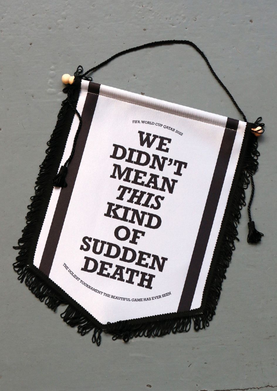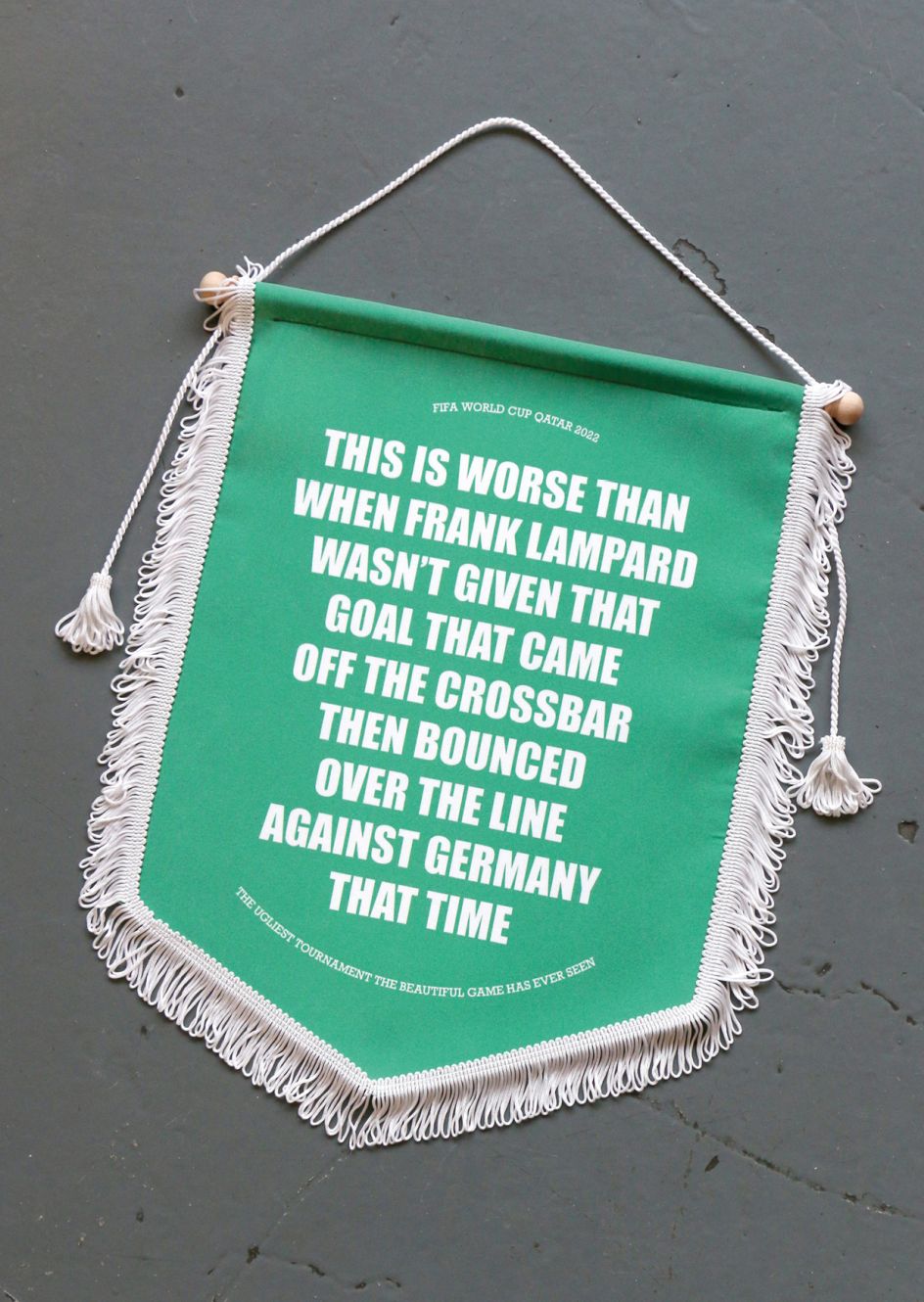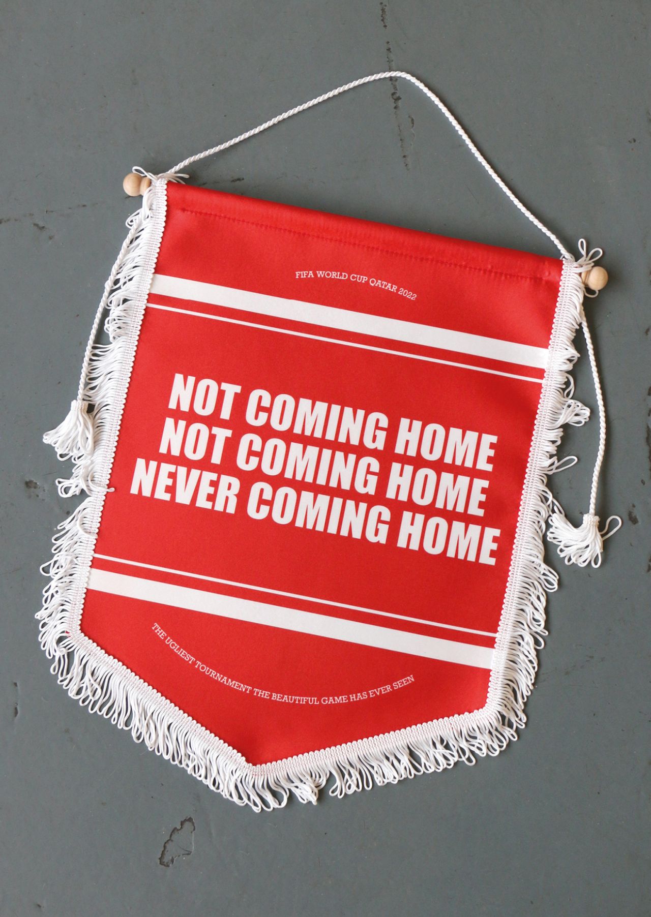 Even the number of pennants in the set is also a dig at the situation in Qatar. "Originally, there were going to be eleven pennants in total – to mark eleven players in a team," Adam reveals. "But instead, there are ten: one less, to highlight how this year's World Cup in Qatar isn't fair."