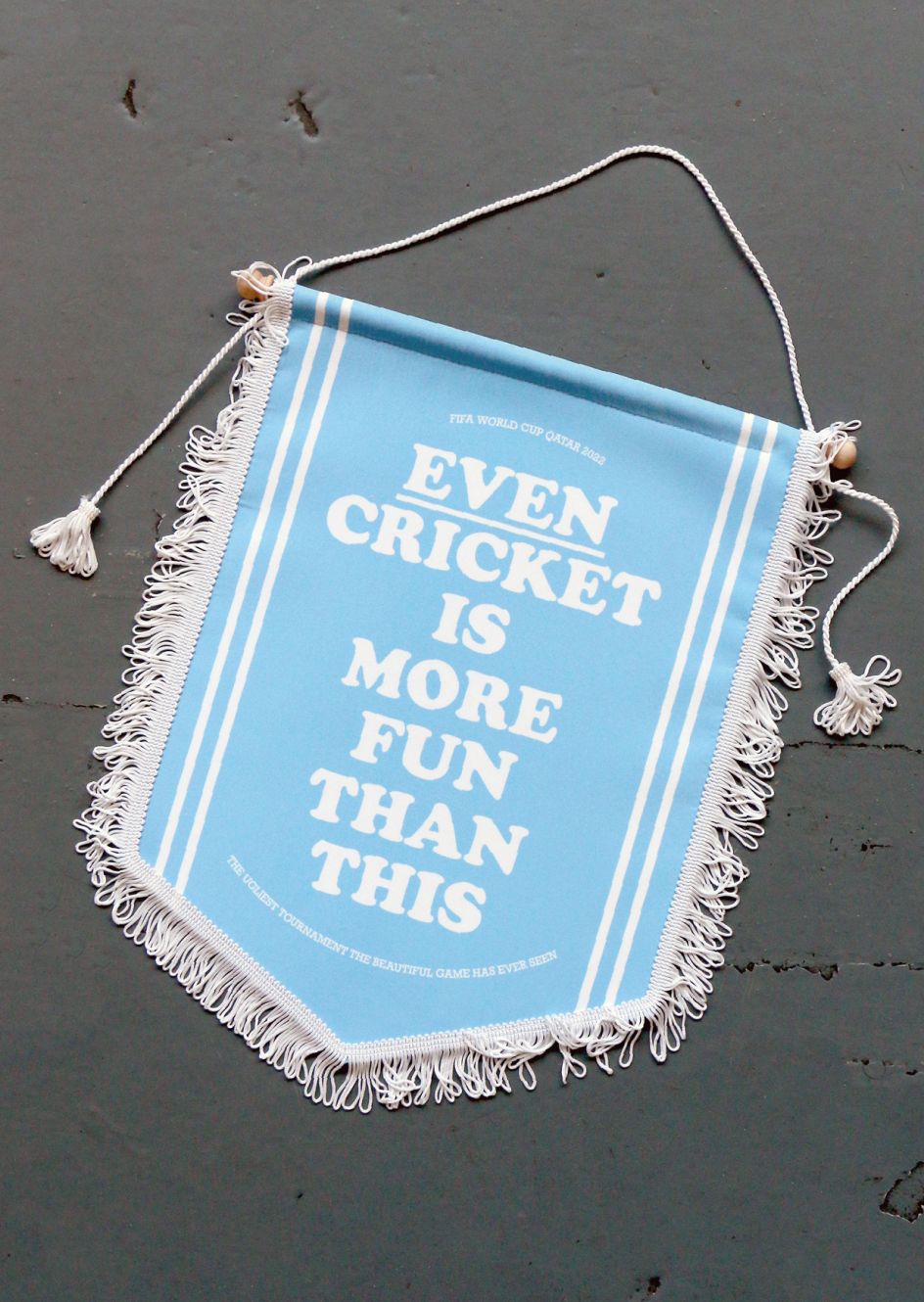 Titled Pathetic Pennants, Adam's project plays with the imagery of the fabric drapes exchanged between teams and players before matches. While this is usually an honourable gesture, Pathetic Pennants turns the concept on its head by proudly displaying messages such as 'World Cup Fuck Up' and 'Even Cricket Is More Fun Than This!'
