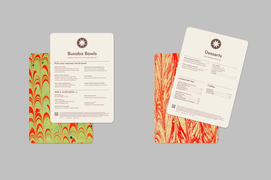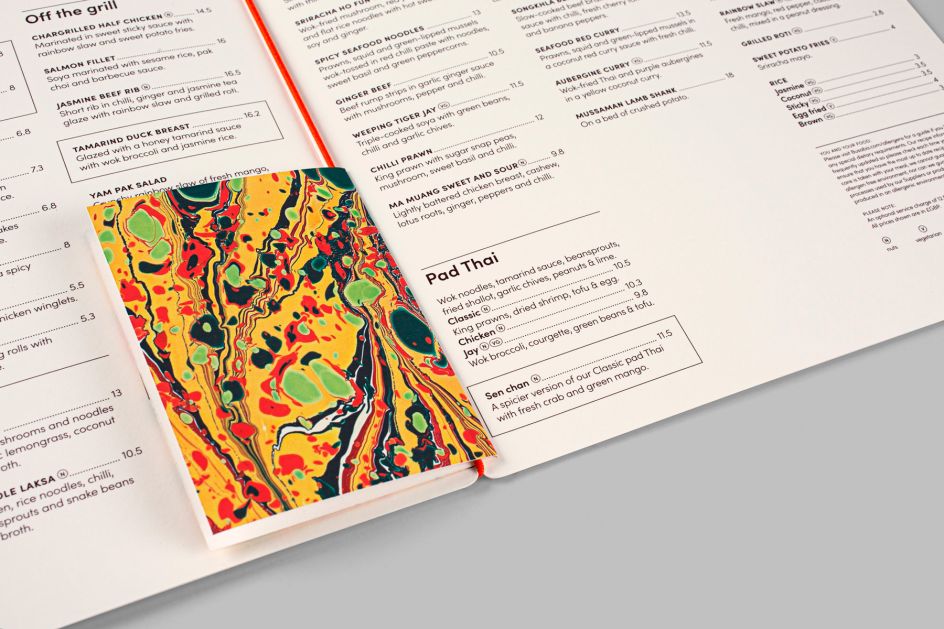 Alongside a new colour palette, Paul Belford introduced a library of patterns that draw inspiration from Busaba’s range of vibrant sauces, visualising the harmonious mix of flavours in Thai cuisine. These feature excerpts from bespoke marbled papers, produced by artist Rachel Maiden.