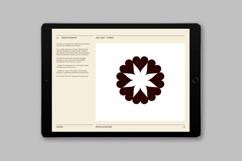 The petals of the flower logo are heart-shaped, drawing on two of the essential philosophies that inform Busaba’s culture: 'Sookjai' and 'Namjai'. The former meaning 'happy heart' has similarities to the Western idea of mindfulness. The latter, 'Namjai' – or 'water of the heart' – encourages taking pleasure in acts of hospitality.
