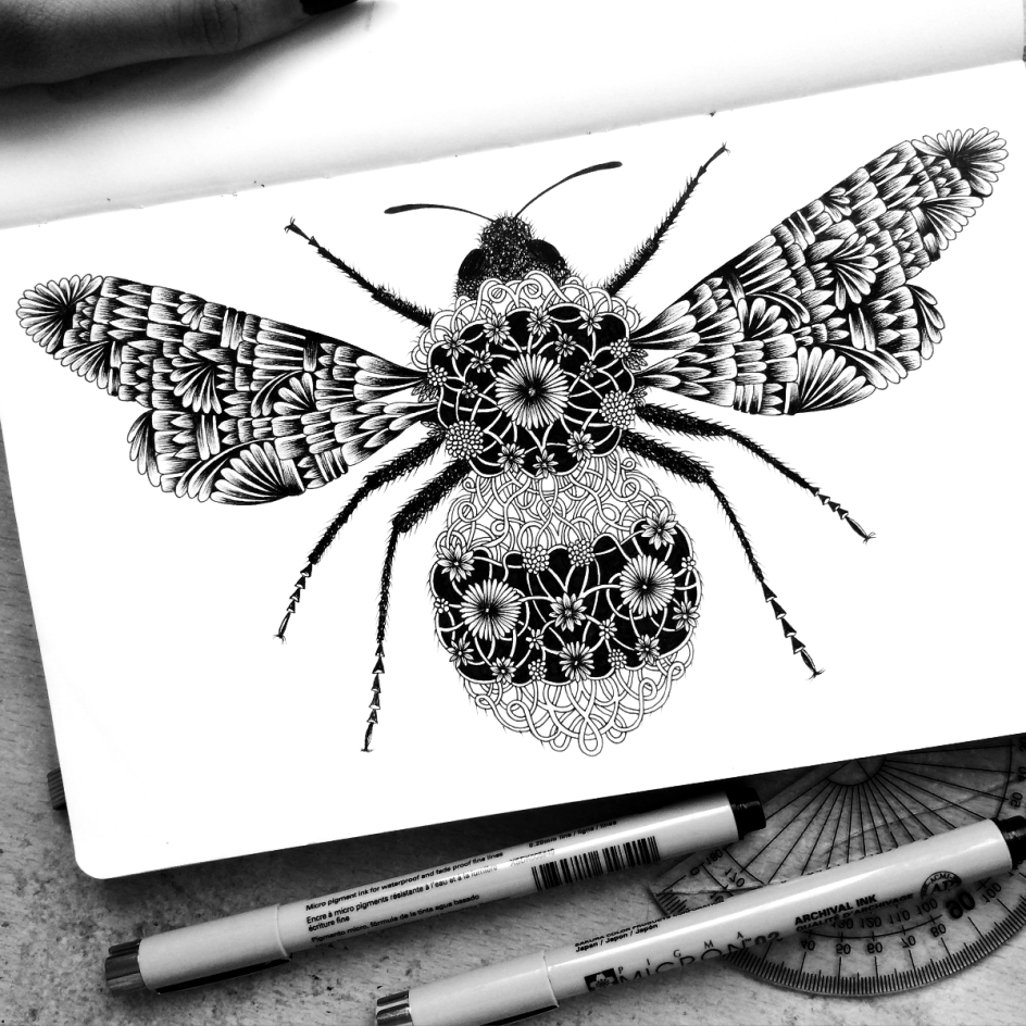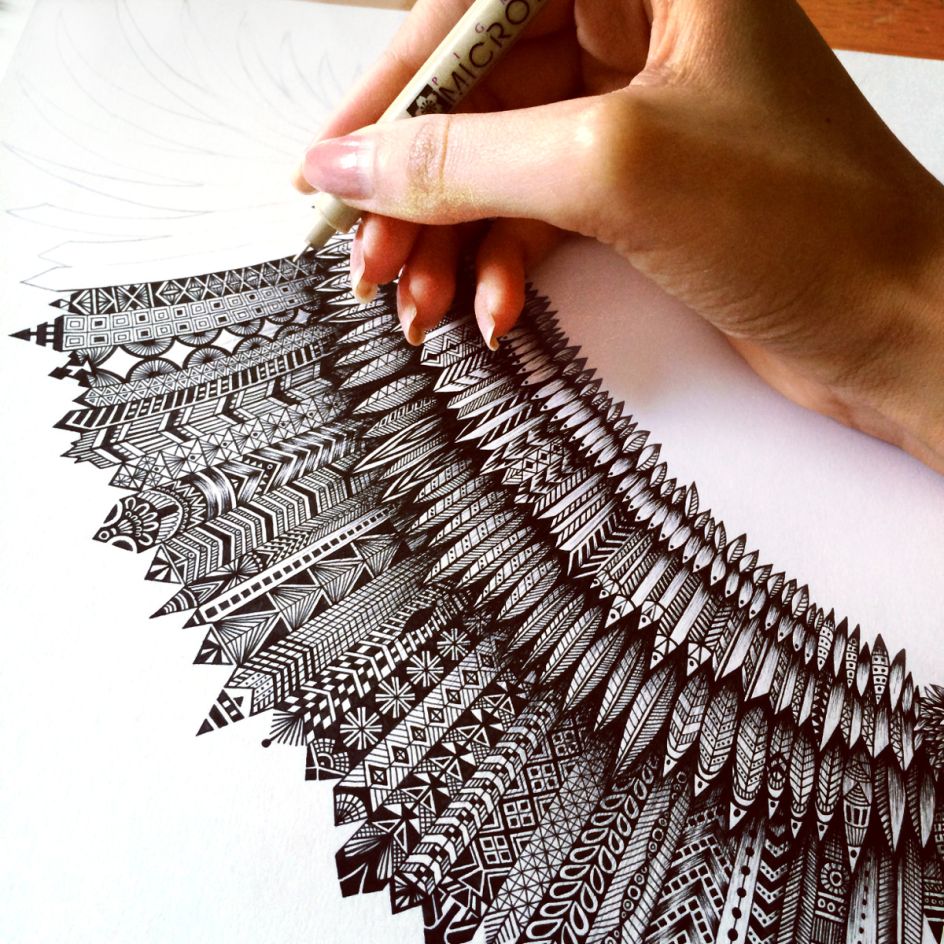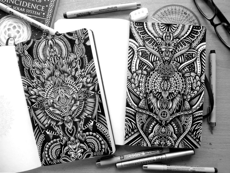 I use 005 Pigma Micron pens to achieve the tiny details and pencil guidelines to help keep the symmetry. Drawing intricate pieces do take a lot of patience and care, the results will not be immediate but I think it’s worth it in the end. I have always loved details; there is just something exciting about seeing a piece that you know has taken many hours to craft and perfect.