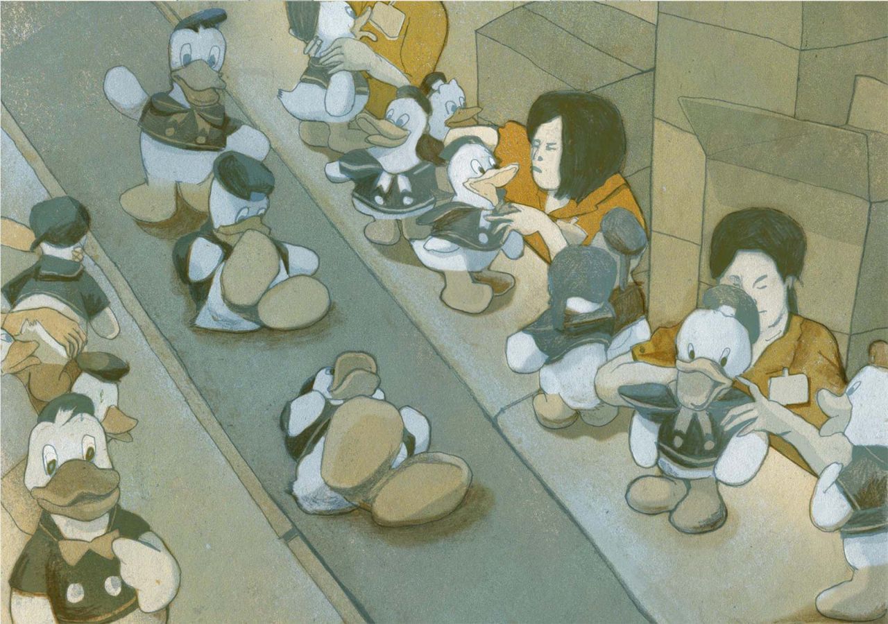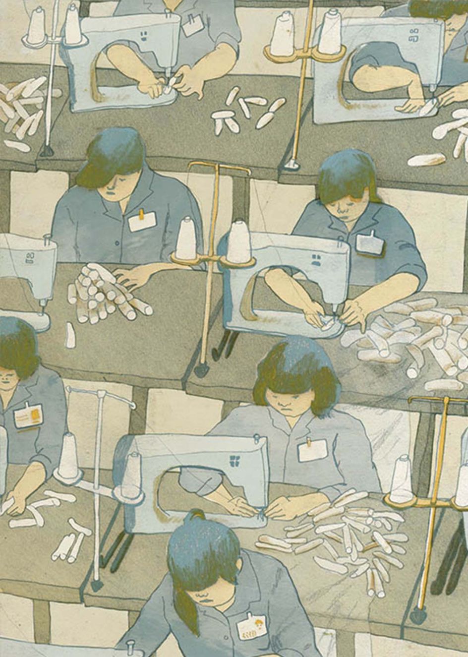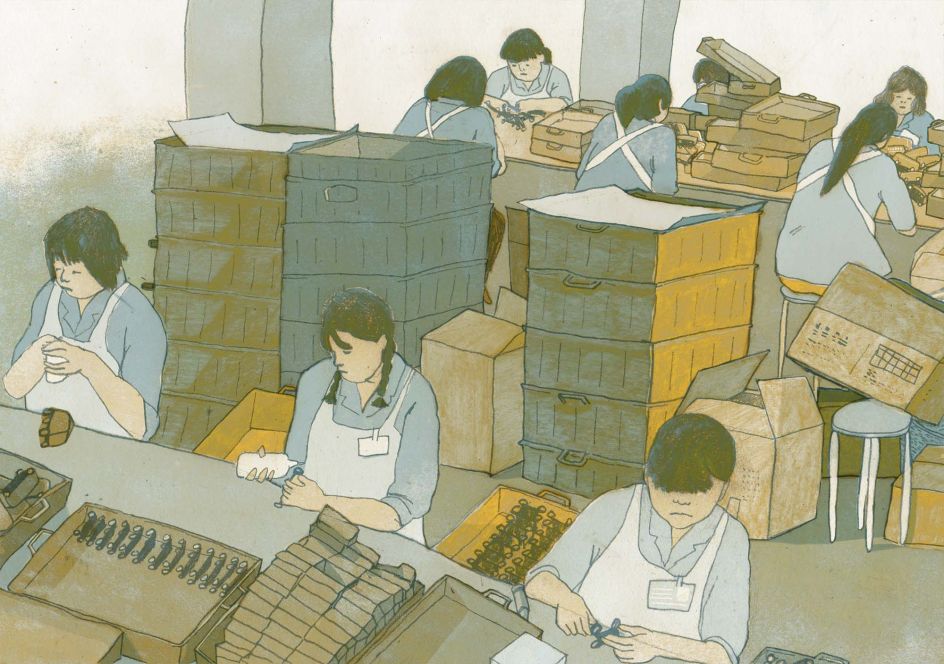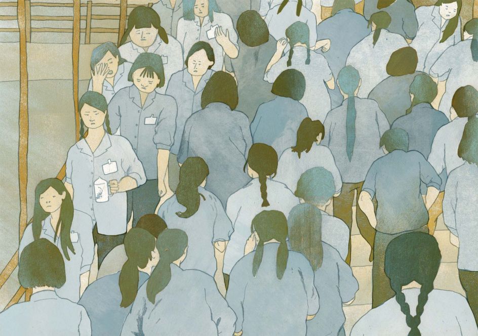 Alongside the personal blogs and diaries she unearthed while working on the project, Chenyue relied on historic photographs as the main source of visual reference. Her drawings are based on recreating these found photos and bringing them to life in a similar way to the stories. "These photos were taken by different photographers and in different factories, but they were taken extensively in the Pearl River Delta in the 1980s-1990s."