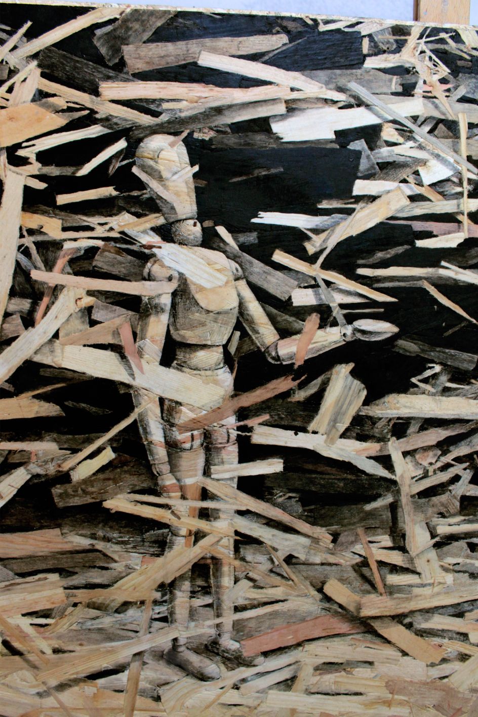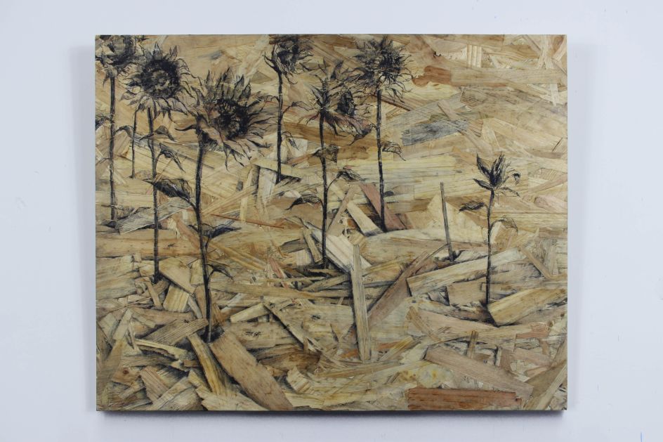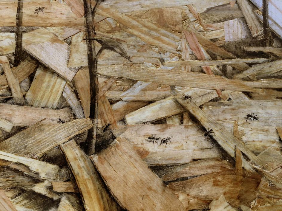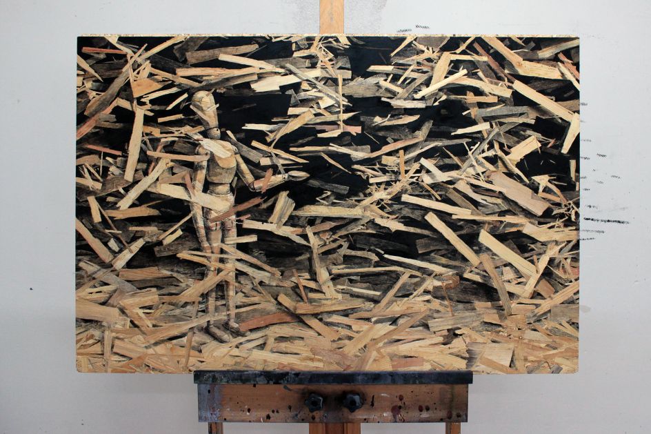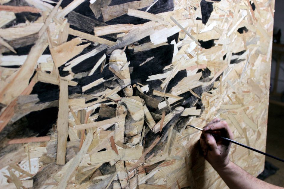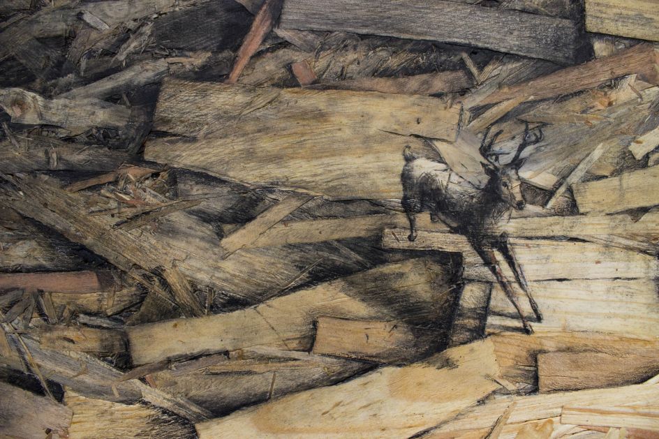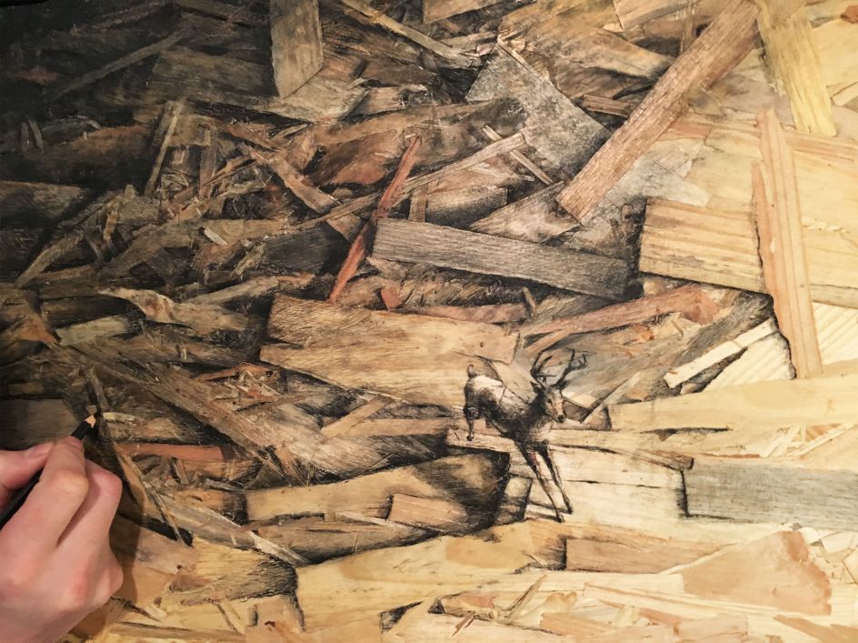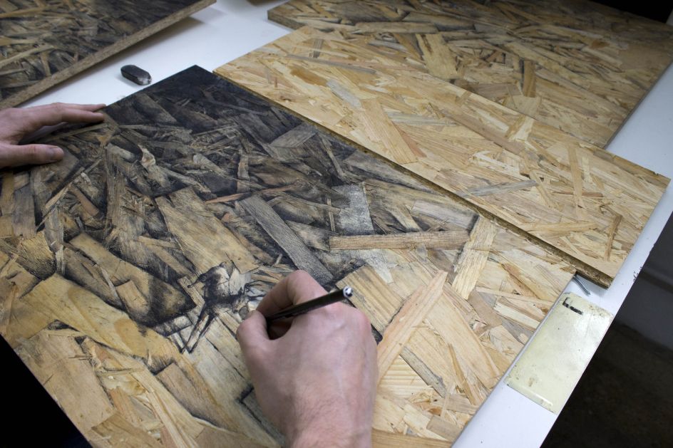 "These panels have some sort of aesthetic warmth but at the same time a sense of devastation, making it very contradictory, which directly refers to my way of understanding art. Expressing myself on thousands of small pieces of wood feels like 'tattooing' on the stripped skins of trees. Each drawing in this Redemption series is a tribute to nature. Any other subject would have been frivolous."