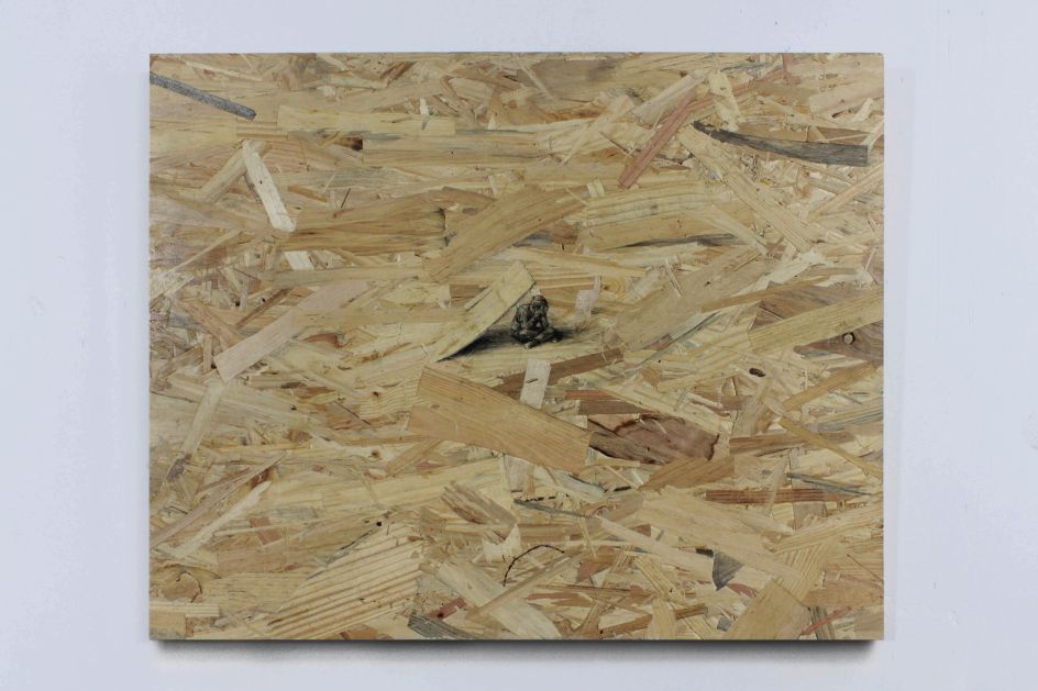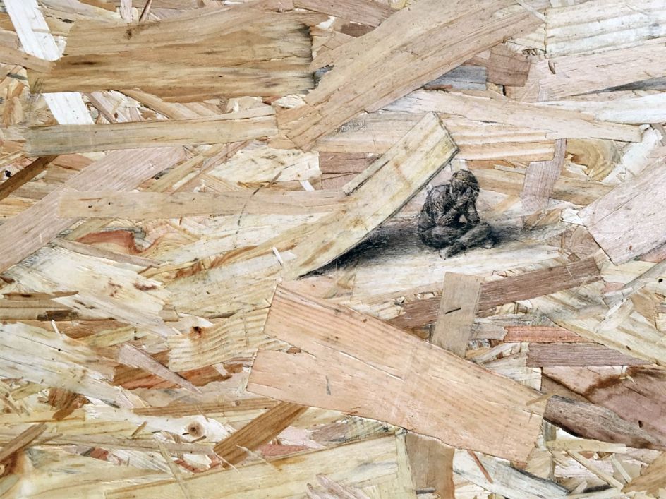In his Redemption series, Spanish artist Pejac uses pressed wood as a pseudo-canvas. With only pencil and ink, he manages to hide some of the existing elements of the material as well as elevate others, creating an effective illusion of perspective within which he places unexpected imagery.