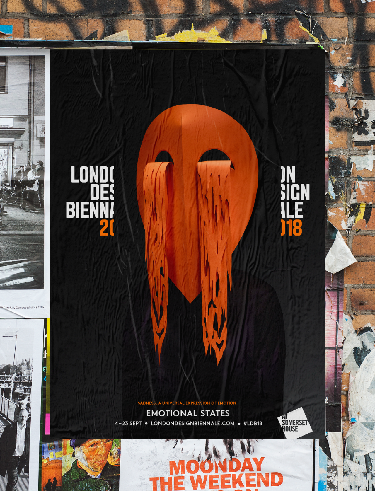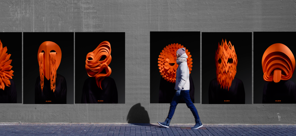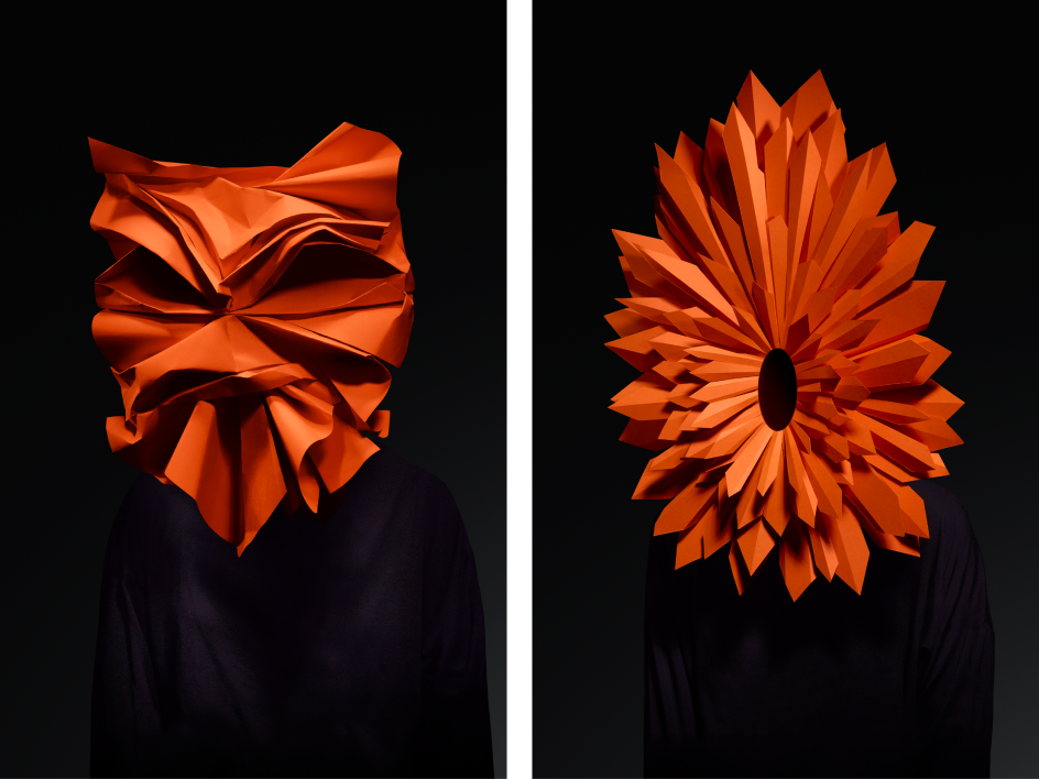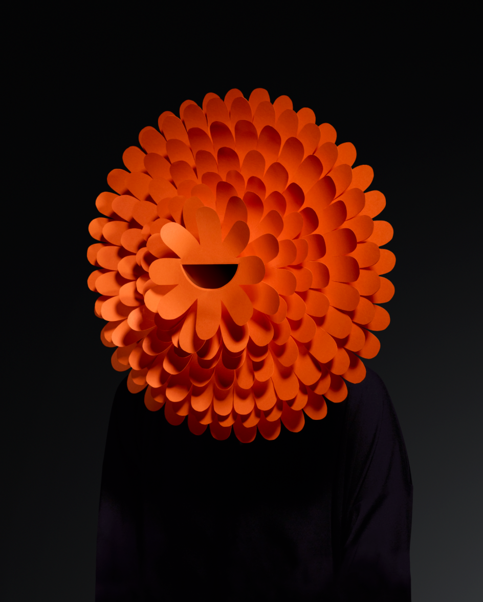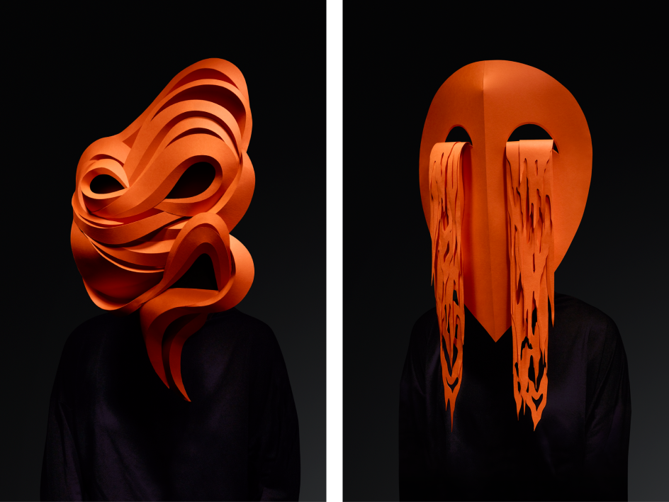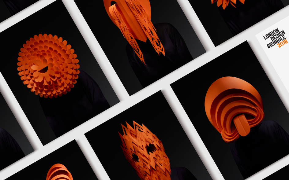 With the theme in mind, Pentagram – for the second consecutive time – created the visual identity and promotional materials for the Biennale, using a strict colour palette of orange, black and white. Taking inspiration from Charles Darwin's seven universal emotions, Pentagram created and commissioned a series of arresting masks, handmade by Wakefield-based paper artist Andy Singleton and photographed by London-based John Ross.