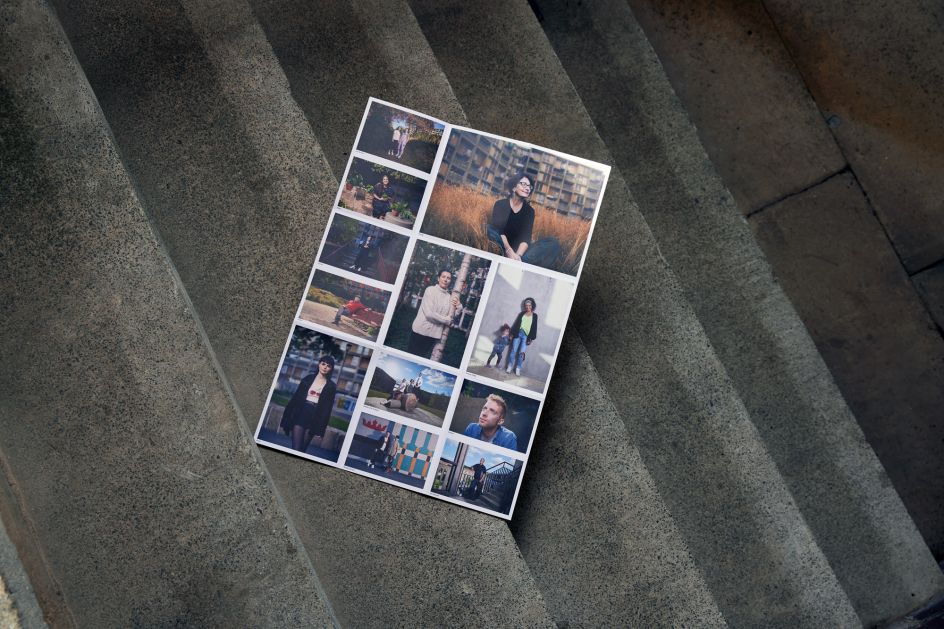 Emily's attention to detail saw the Brutalist estate reflected in the materials used to create the mailer. The layout also channelled the huge concrete structure, as the double-sided concertina printed insert is unfolded horizontally and vertically, extending like a block of flats into the sky. One side features the portraits stacked on top of one another, while the reverse folds out to reveal an epic landscape poster image of Joanne, one of Park Hill's original residents.