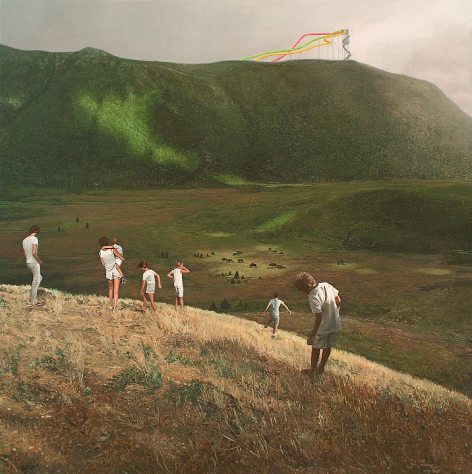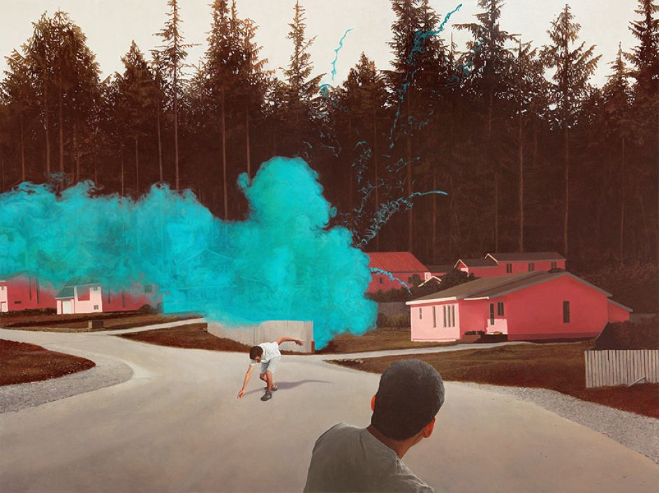 Roulette explains: "Through painting, I depict fictional and occasionally fantastic scenes that explore the blurred sense of time and place within memories. The dreamlike landscapes incorporate familiar elements of suburban life that both stylistically and symbolically represent a quasi-nostalgic ordinariness. The isolation and dislocation of cars, houses, and figures, and the exploration of subtle spatial relationships, recall the hazy state of dreams in which certain details fall into place while others fade away into the unconscious."