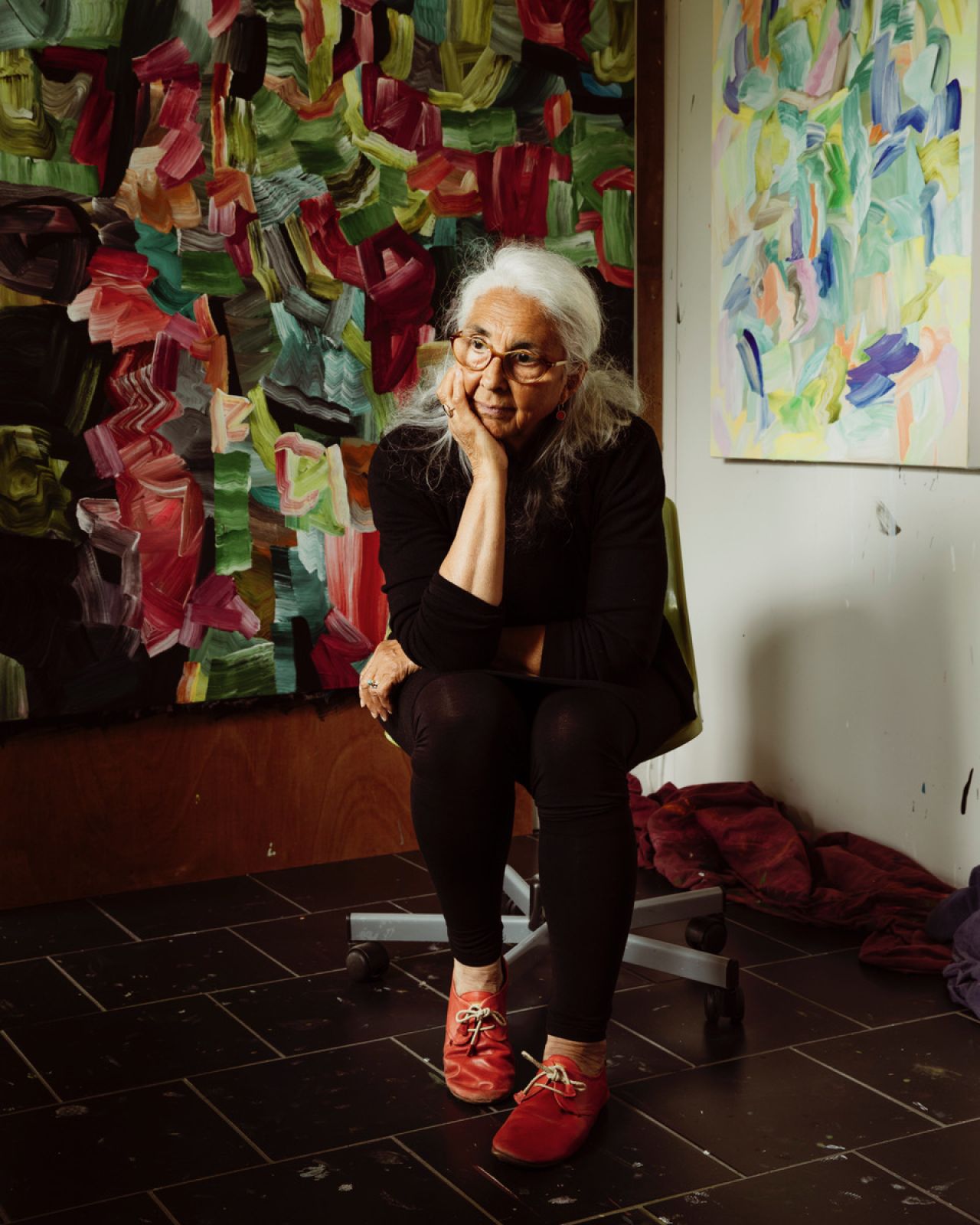 "Discovering where people work is always a nice surprise," he says. "Their environment so often takes a critical role in how they create their work. Painter Paul Emsley, for instance, took me to the back of his garden, where he'd installed a full-size shipping container. It was craned in across a ditch from a neighbouring farm, with no windows. But the light inside is made from a DIY contraption that he can move around the floor. That light was perfect for his portraits, and the windowless steel box somehow really matched the dark and chaotic mood of his abstract paintings nailed to the walls".