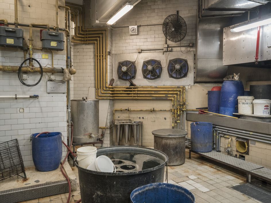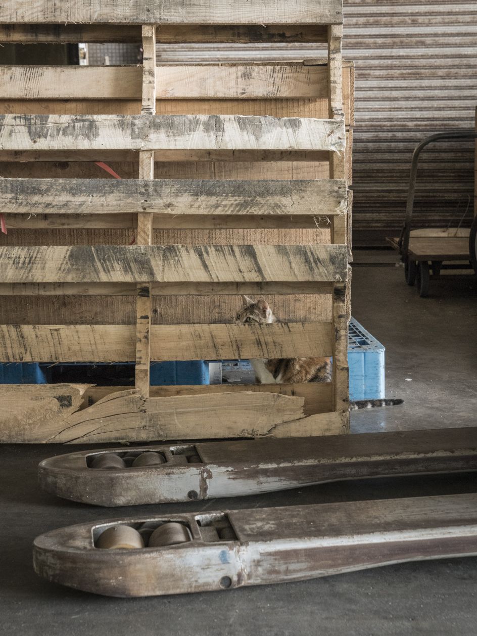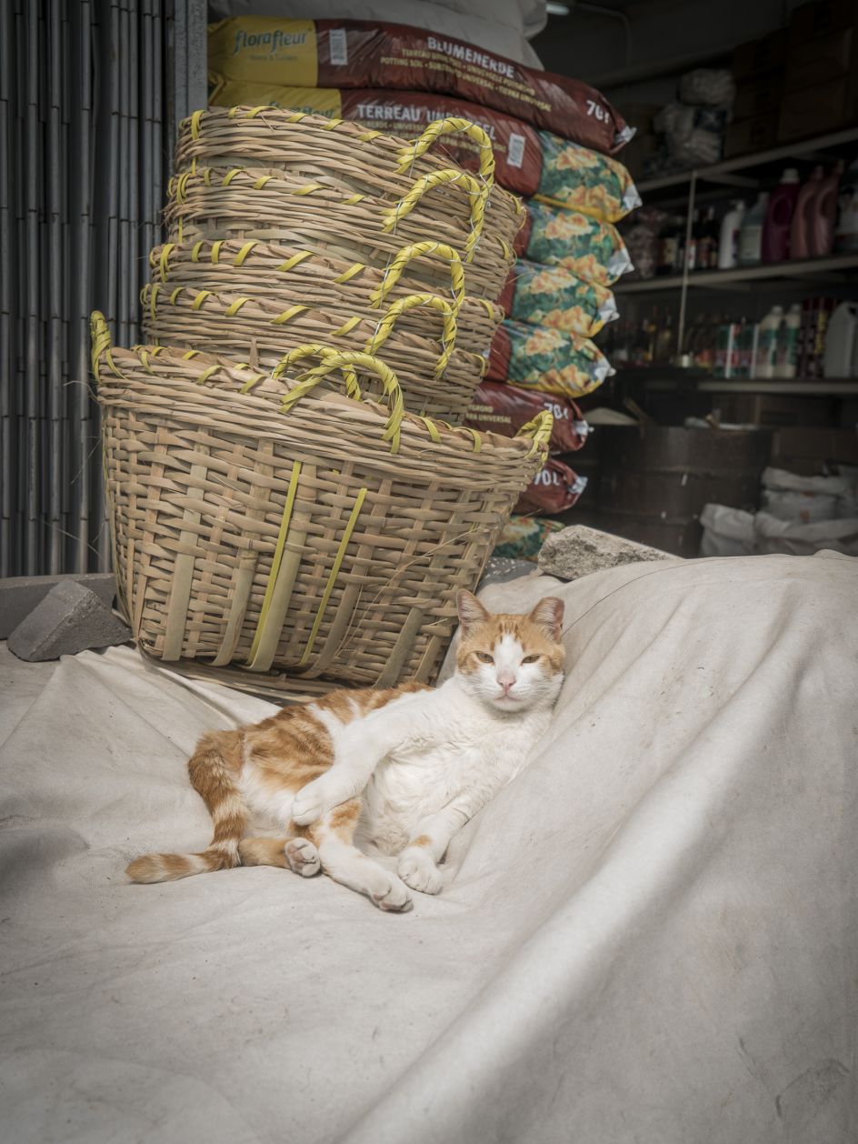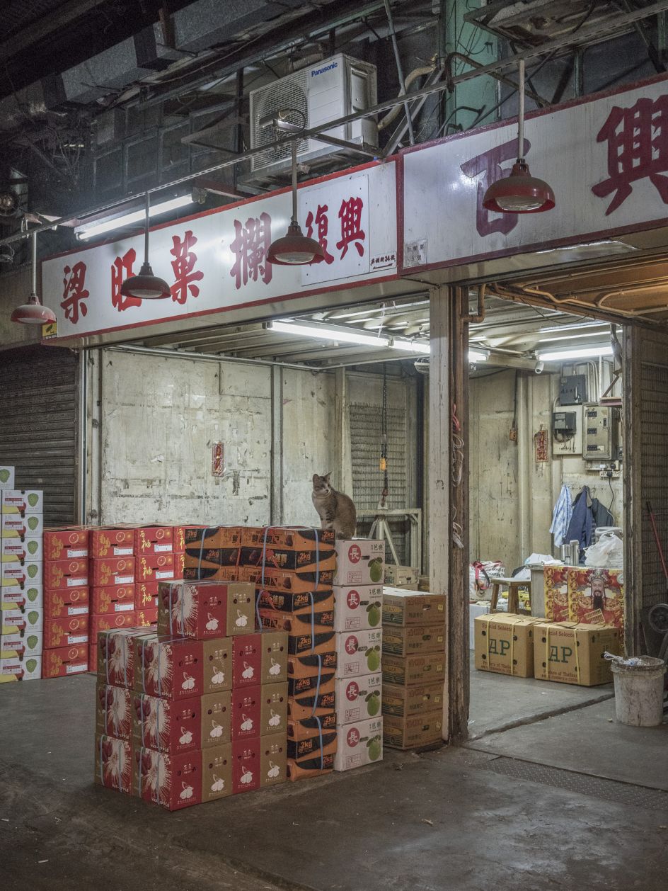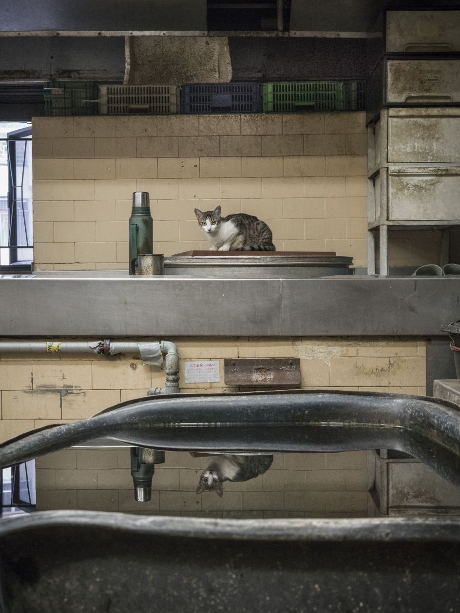 "Again, the series is as much about the context as it is about the beautiful animal. The backdrop takes centre stage. And while there are lots of similarities with the Shop Cats series, there are distinctive differences as well. For starters, the markets are more chaotic and less clean than the shops. Boxes, crates, grimy walls, forklifts, pallets. More human activity and perhaps a bit less of a connection between the owner and the cat. Markets are busy places in which fresh goods move rapidly. They make for more dynamic subject matter."