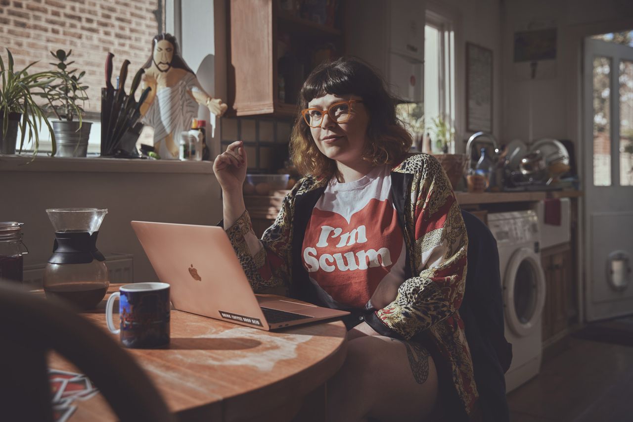 His flatmates, who work as a graphic designer, for a theatre production company and in music distribution, were pretty willing to be subjects, it turns out. The project was an interesting creative challenge for Holbrook. "It's not the sort of thing I'd usually shoot," he says. As well as taking their picture, he also asked his flatmates – Esme Deacon, Josh Burchett and John Beaumont – to sum up, their first month of lockdown in three words. These ranged from, respectively, "memes" to "Supermarket-Sweep" to "boozy."