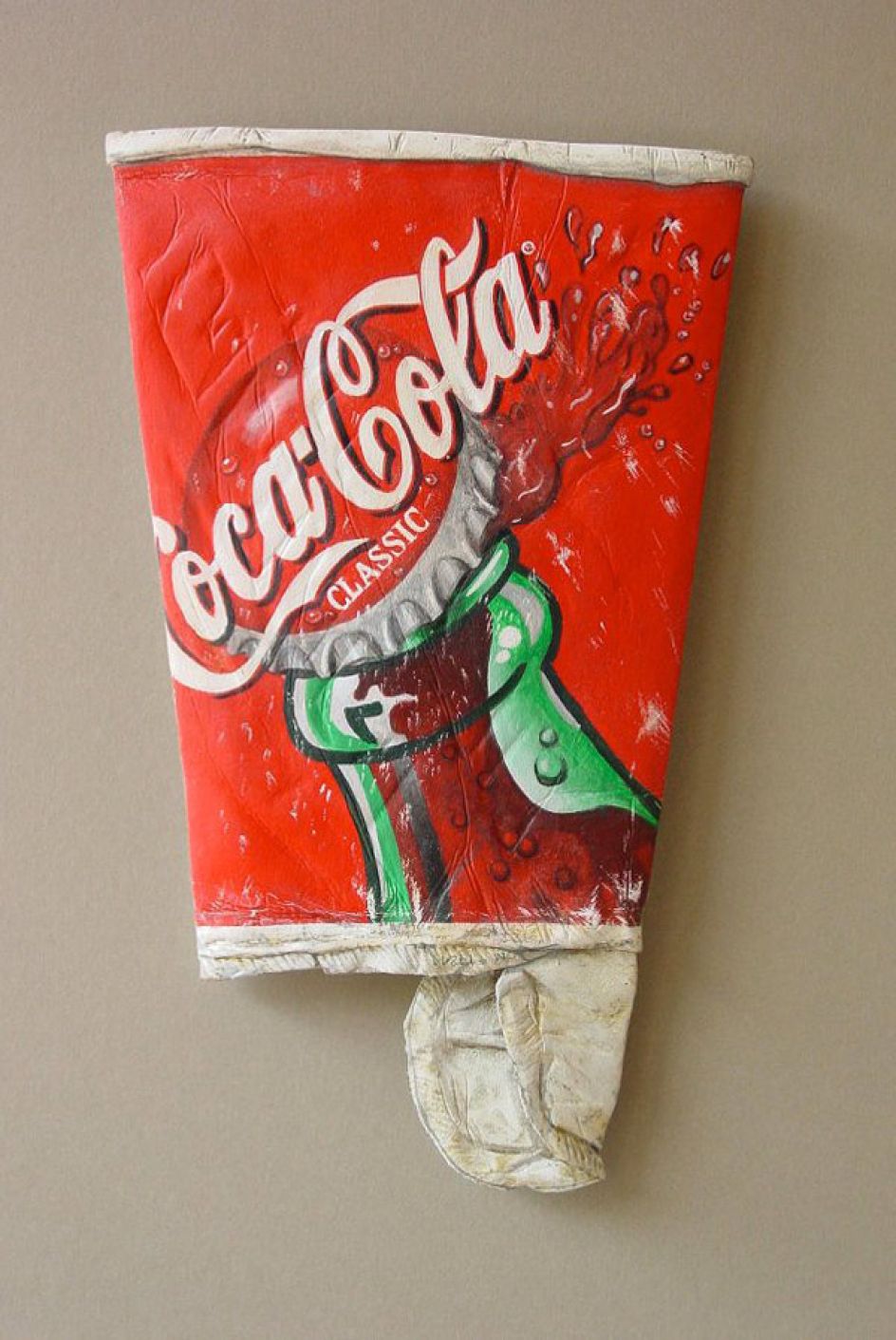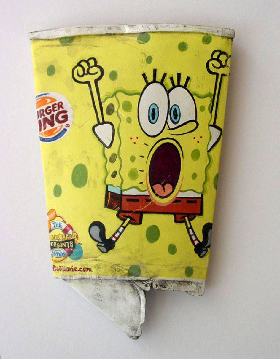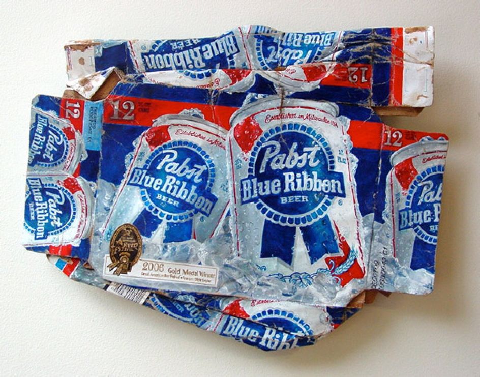 On the first inspection, you would believe that you're looking at discarded packaging and general litter. When in fact, it's a detailed painting and carved wooden sculpture by artist Tom Pfannerstill.
