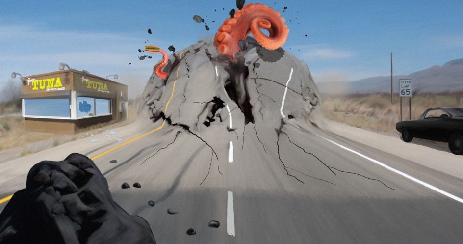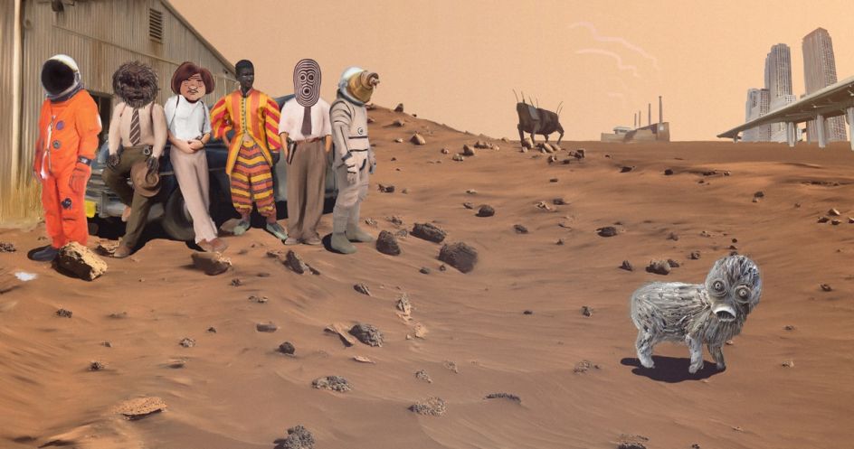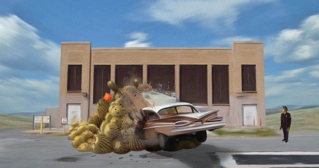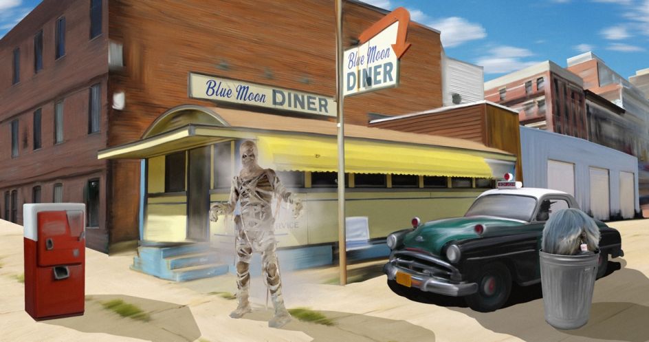 A bottle green vintage car is slotted under the yellow awning of the Blue Moon Diner, while a mummy stands by. A woman rides an escalator through a twisted, concrete landscape reminiscent of a scene from Fear and Loathing in Las Vegas. An unmistakably 1950's brown suit and hat balance in mid-air in front of a hotel tower block, with a yellow taxi cab parked outside.