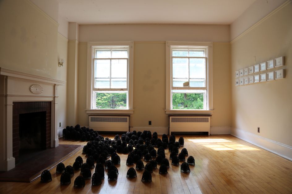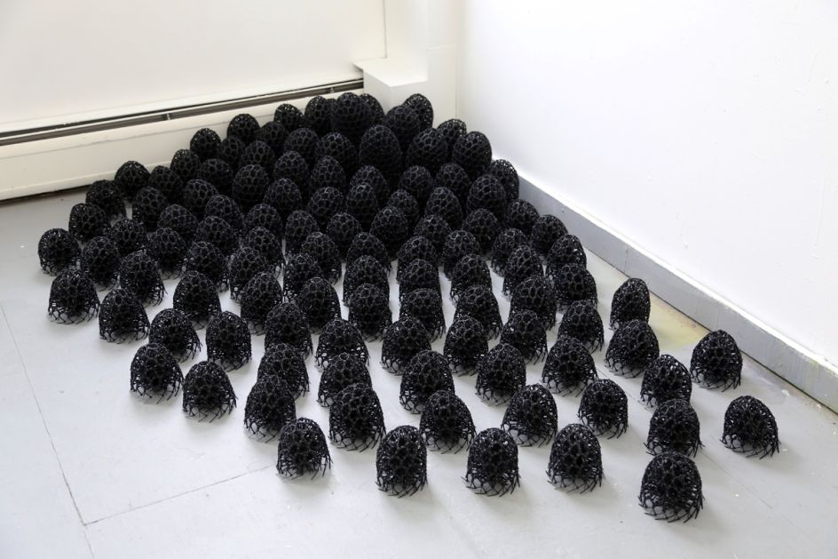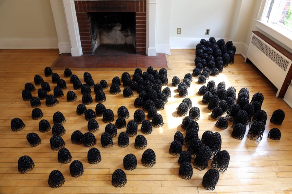 In her installation Presence, New York artist and interior architect Sui Park invades a gallery space with over a hundred miniature black creatures, that immediately remind me of Hayao Miyazaki's sootballs from Spirited Away.