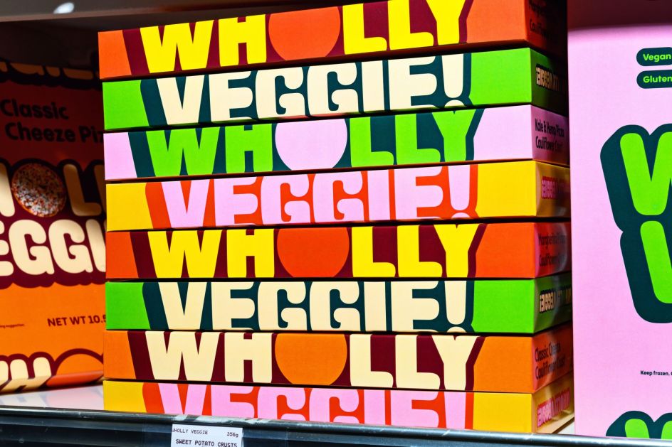 Rather than honing in on product photography, the designers opted to make Wholly Veggie's new branding the focal point of its packaging to create an on-shelf standout.