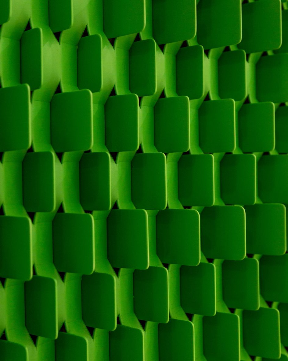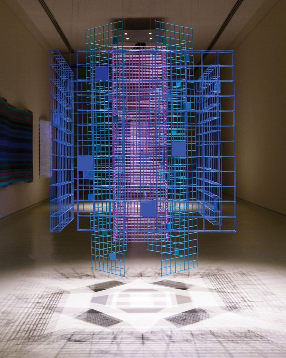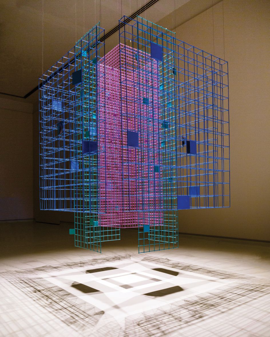 Aluminium mesh wall works, suspended steel grid mobiles, and a monumental maze form the basis of this immersive exhibition inspired by architectural grids and geometric lattices.