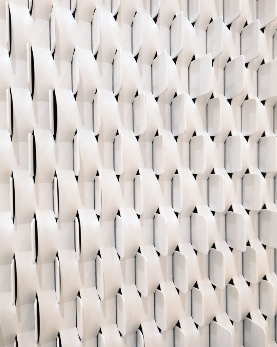 Upon entering the first exhibition space, you encounter convex wall works adorned with colourful flaps that suggest a feeling of movement. Rashid refers to the wall-mounted aluminium pieces, whose intricate patterns are based on complex mathematical geometric design, as "parametric sculptures".
