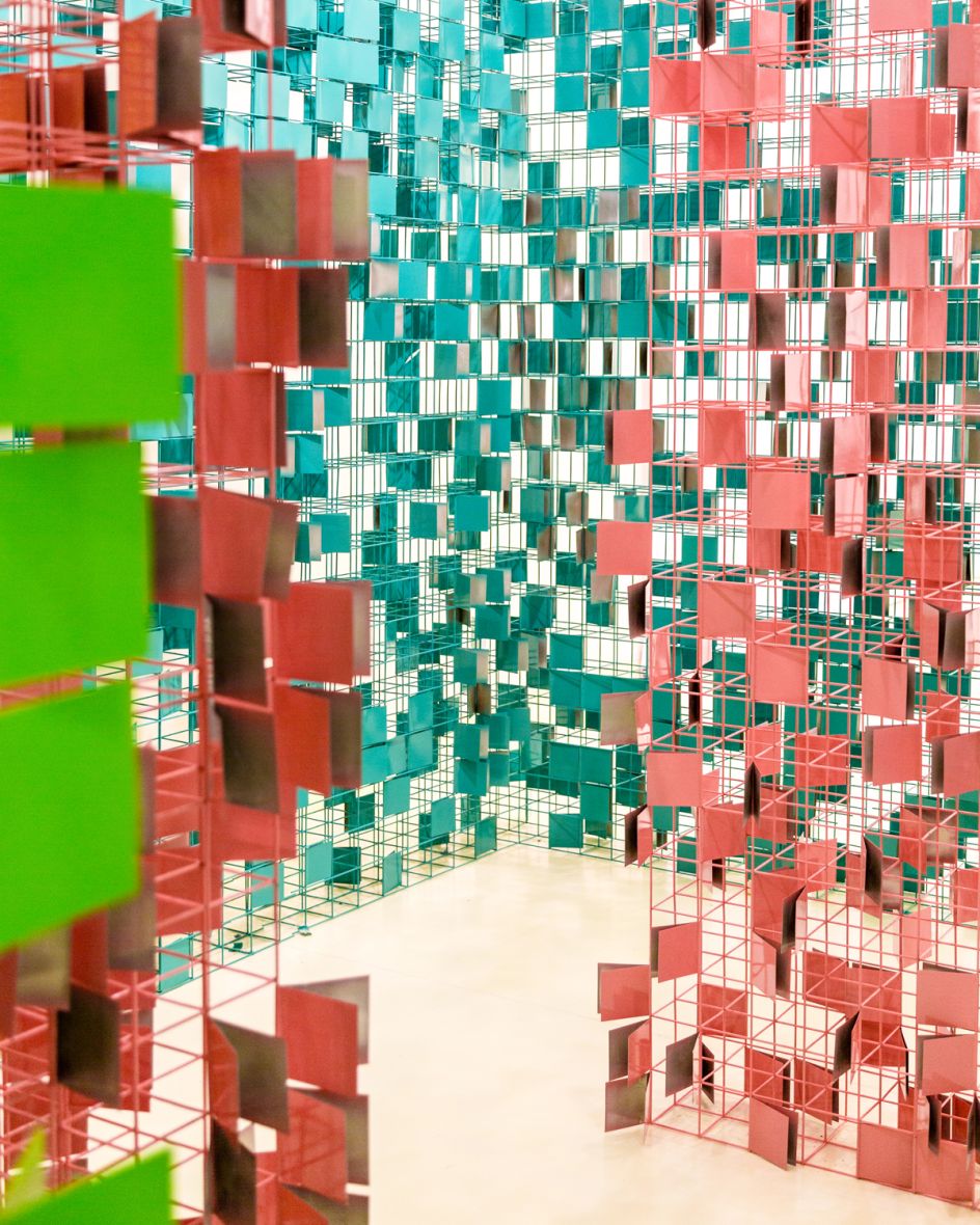 In the centre of the room, three-tiered mobiles wreathed with geometric flaps are suspended from the ceiling, drawing you closer. There is tension created between the vibrant and ornate steel grids and the calmness of the voids within, just out of reach in a realm of semi-privacy.