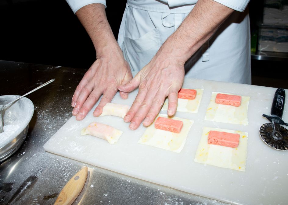 To reinvent the snack, Regular Practice worked with the co-founder of Mochiya, a Swiss-British chef known as Florian, who sourced the traditional mochi ball and flattened it to a plush pastry pillow. He then infused it with ice cream and sorbet using ingredients sourced from around the world, from English fruit farmers to friends in Taiwanese tea fields.