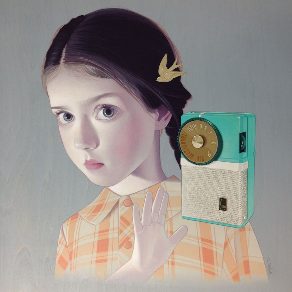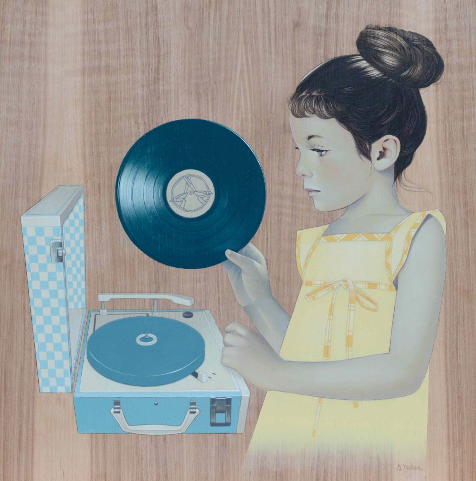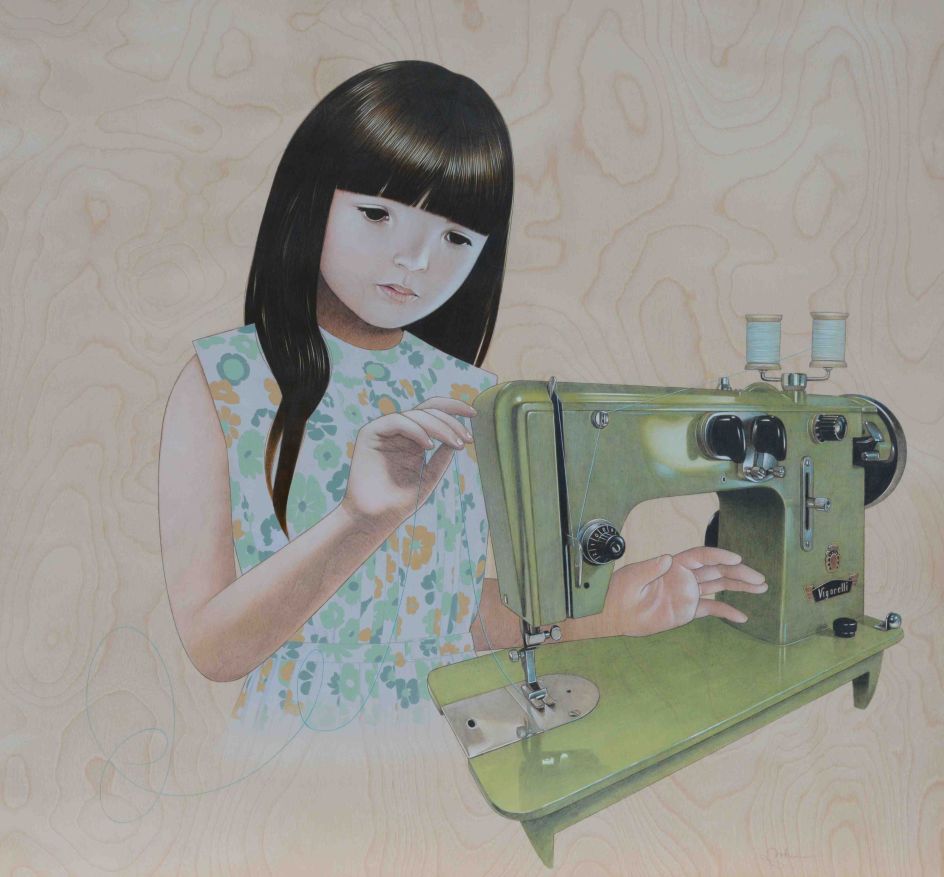 Concurrently on view at the Thinkspace Gallery in Culver City, Rendered Problematic features new works by Sean. A mixed media painter from Florida, he creates soft and subtle figurative works in graphite and acrylic washes on wood panel. A cultivated nostalgia persists in his paintings, as shadowy images of picturesque and serene children in light pastel and vintage palettes handle records, dated appliances, and classic sewing machines. The wood grain is preserved with a quality of transparency throughout, adding a dimension of warmth and organic variance to the works.