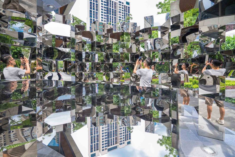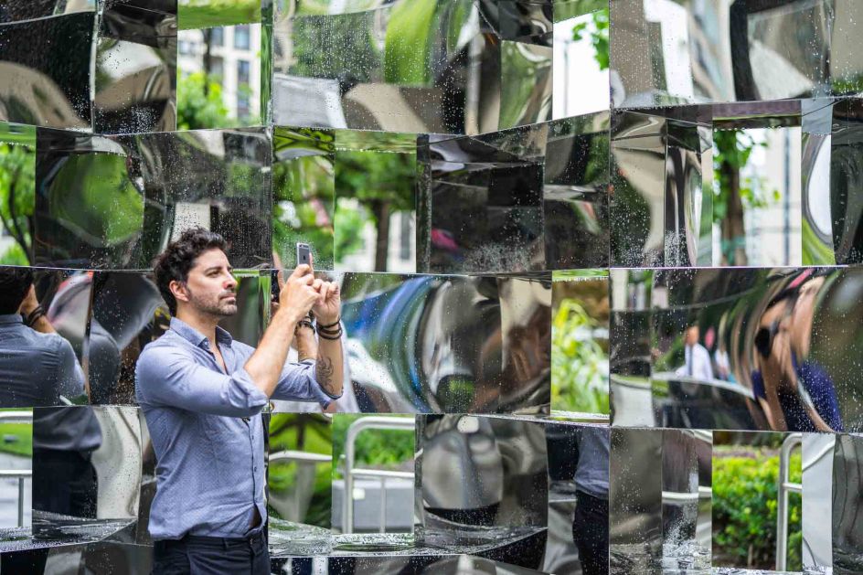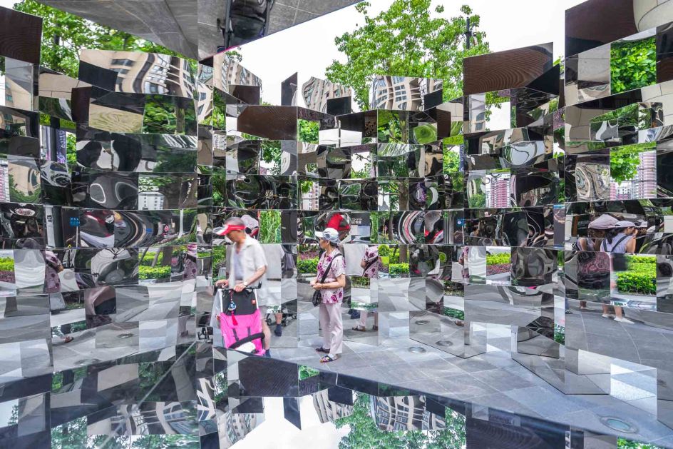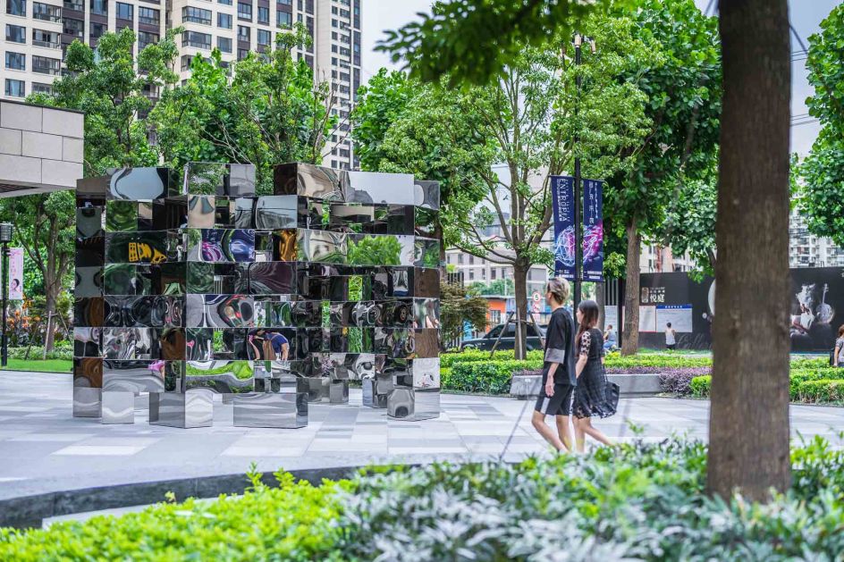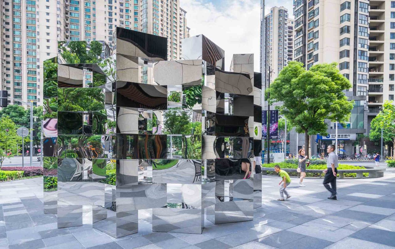 The sculpture, which activates the pedestrian plaza creating a dynamic and interactive atmosphere, has been created using a repeating series of large mirror bricks, enabling visitors to enter the enclosure and to see their own reflection multiplied to infinity.