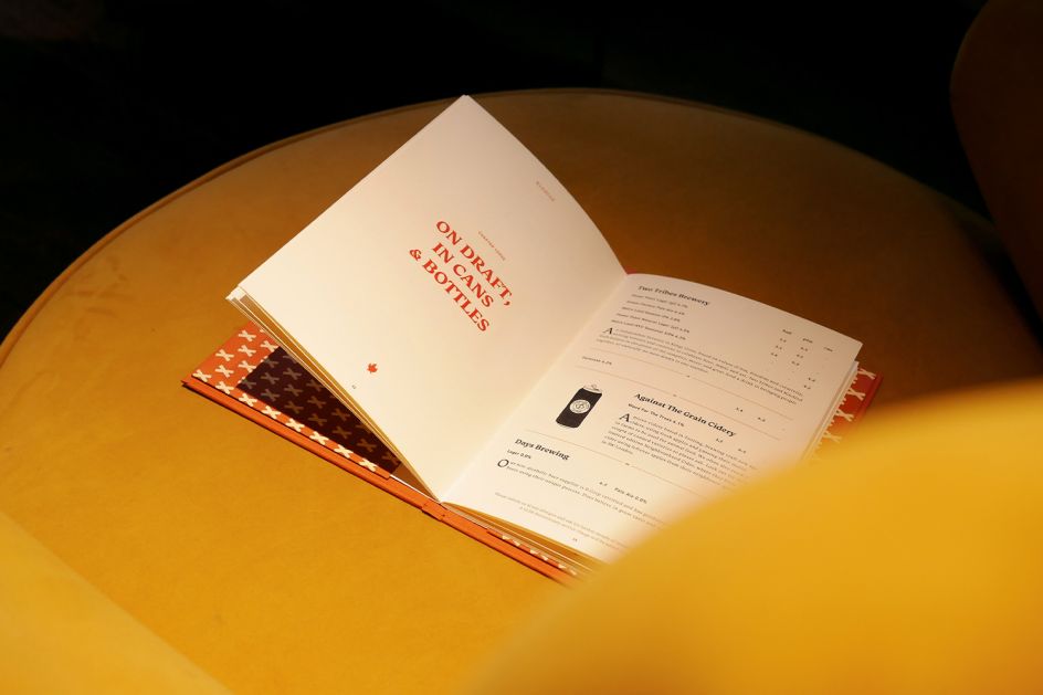 After thoughtfully pairing perfect typefaces and adding extra decorative touches, the studio started to work up the full suite of menus. The pièce de resistance is a stunning 40-page drinks book with a tan-orange cover featuring an understated campfire emboss printed on subtly textured Fedrigoni paper with matching orange stitching.