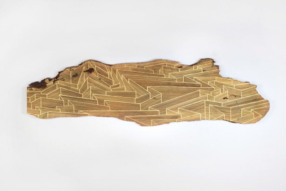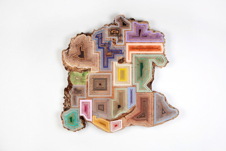 Based in Hudson, NY, his colourful patterned compositions, painted onto the natural raw material of sliced tree trunks, make for an intriguing combination and sharp contrast.