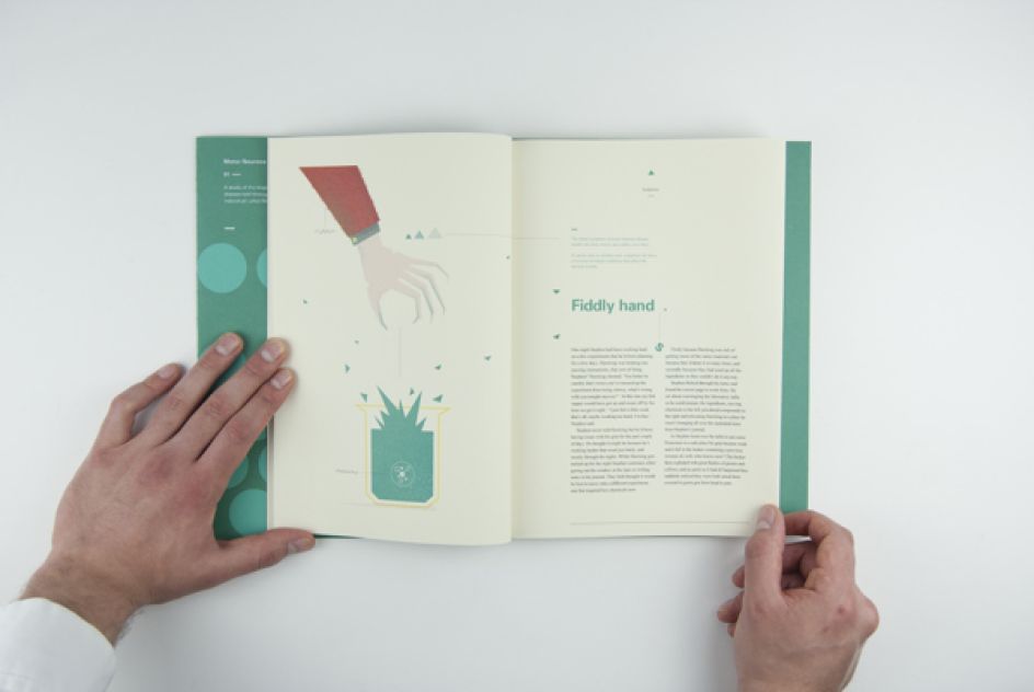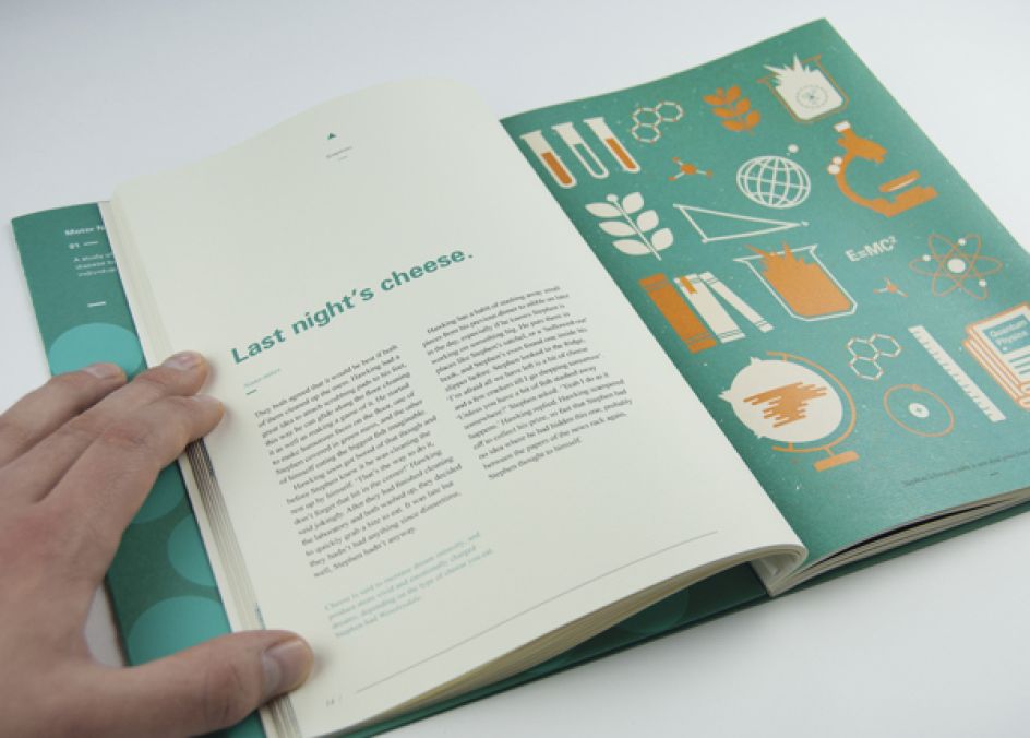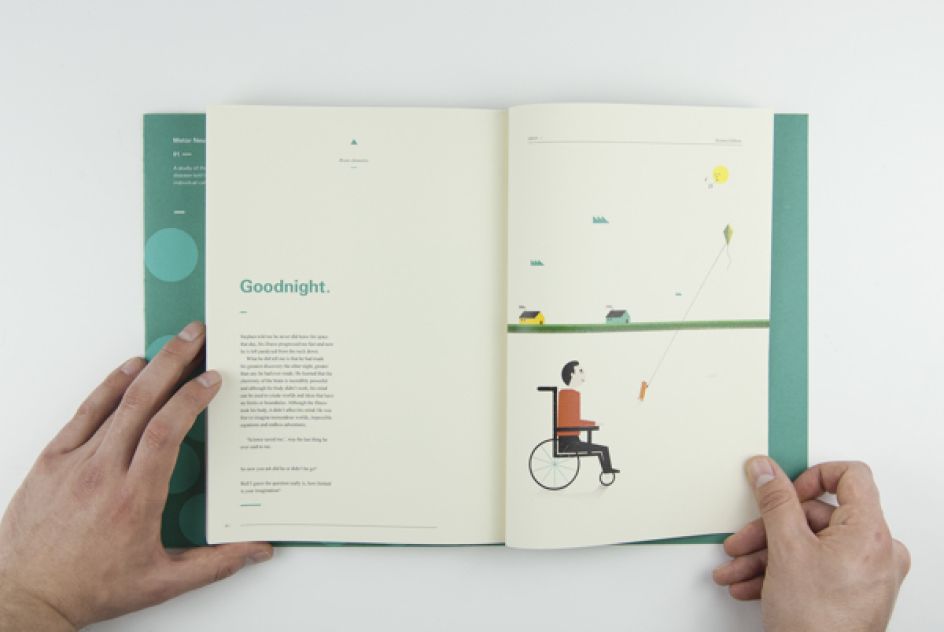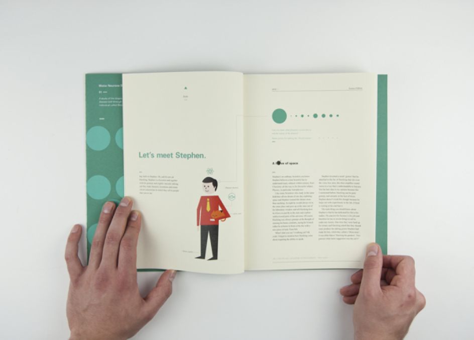 When Jason Booth was presented with the brief of how he - as a graphic designer - could explore brain chemistry in relation to motor neurone disease, the result was Science Saved Stephen - a 60 page publication about a character called Stephen who is diagnosed with the disease.