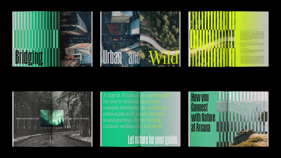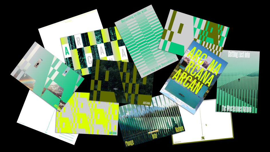 Created by design student Hyeji Lee, this project aimed to develop a hospitality brand with a flexible system, to apply in versatile contexts for the brand: print, web, mobile, collateral, motion and space. Arcana imagines an immersive nature retreat in a hidden forest a few hours away from the city. It offers an exclusive stay and memorable experience connecting with the power of nature. The cabins are clad in reflective stainless steel and are virtually invisible in the surrounding nature.
