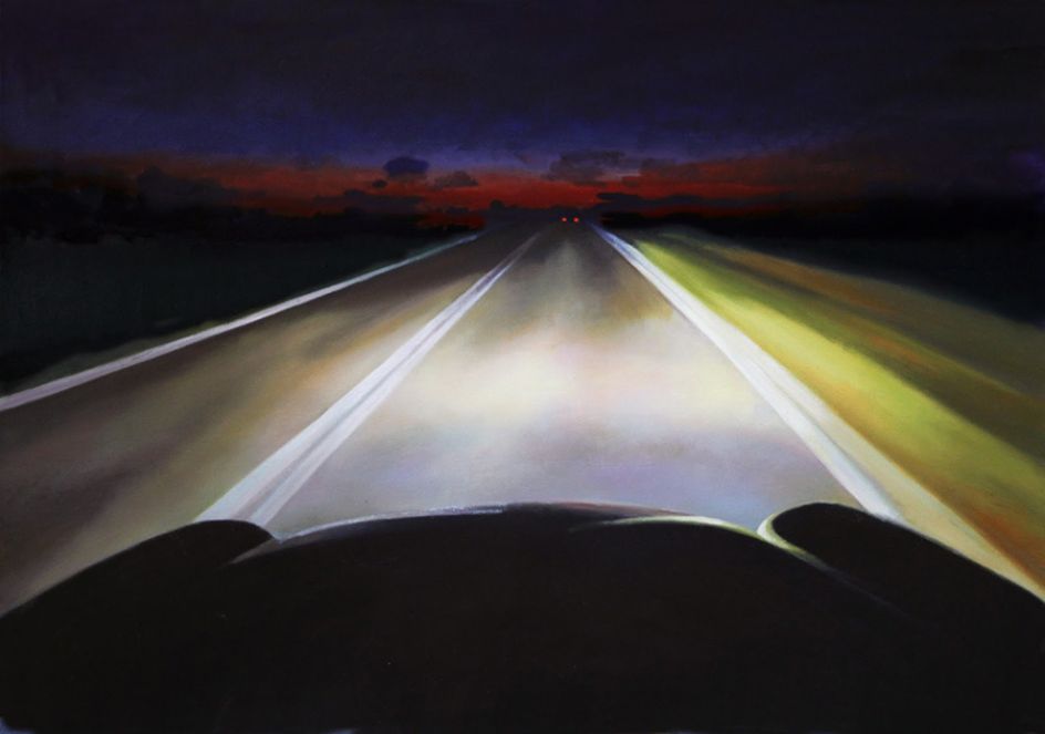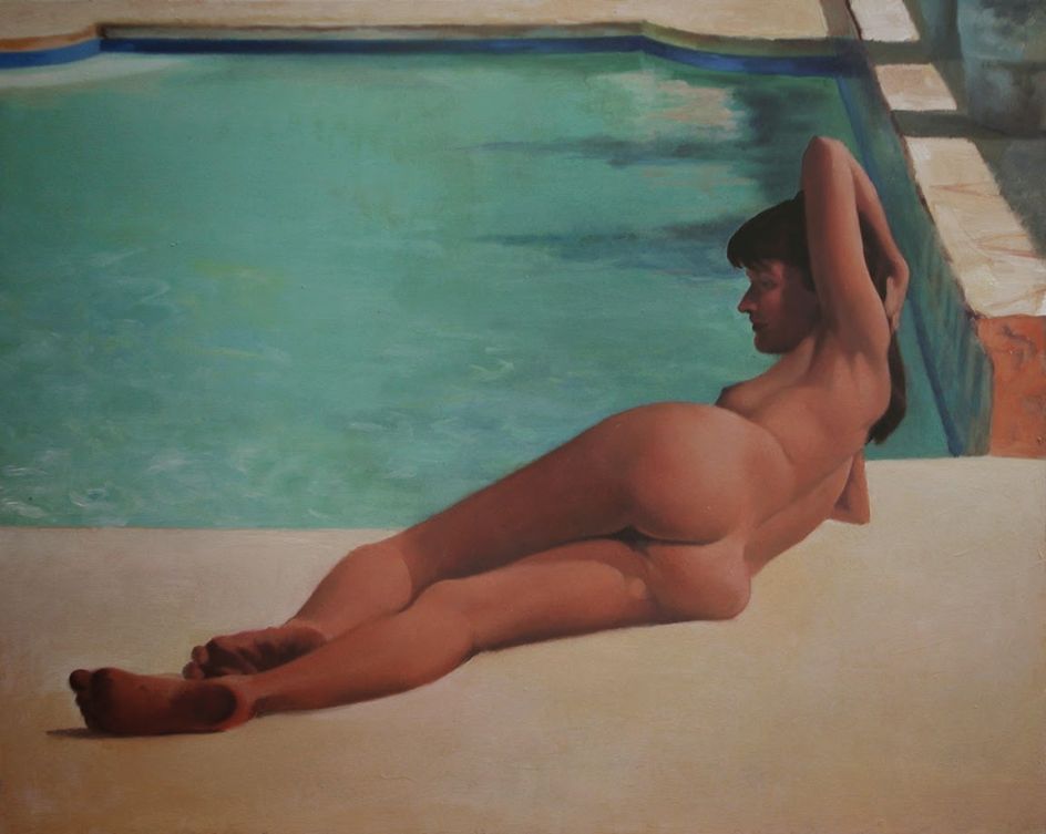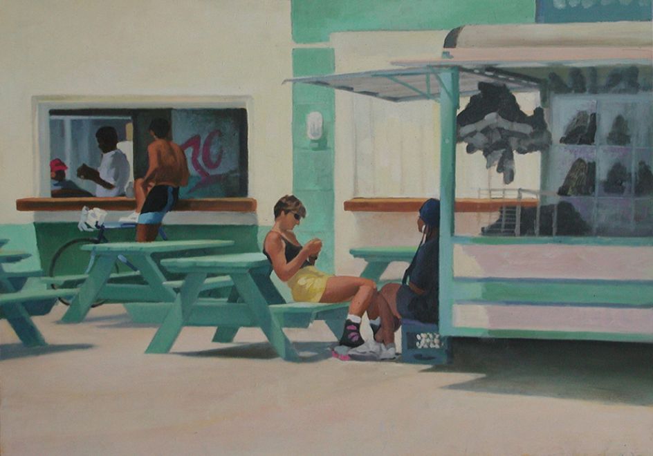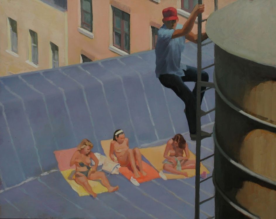 With small-format oil paintings in sumptuous colours, he shows us glimpses of classic Americana, including everything from baseball parks and skateboarders to nude sunbathers capturing a little sunshine in the heart of the city.