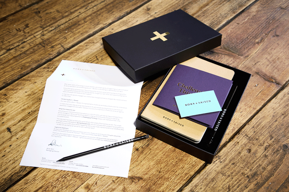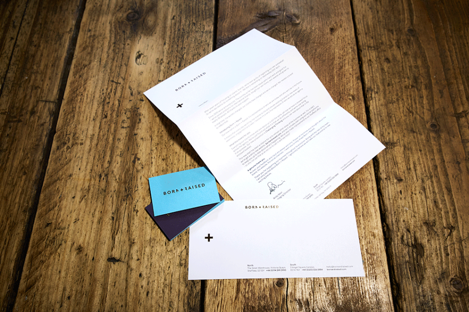 A sophisticated and minimal plus sign sits at the heart of the branding for Born + Raised, the new incarnation of Sheffield and London-based creative agency We Are. It’s a clever use of a common conjoining symbol, used as a little module across collateral such as stationery and print pieces, as a dynamic online animation, and of course as an integral part of the agency’s new name.
