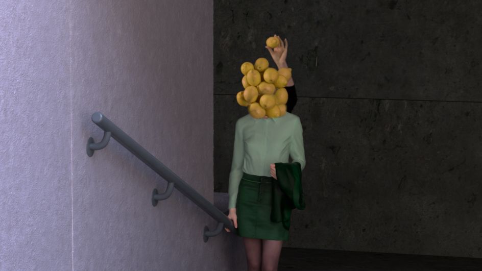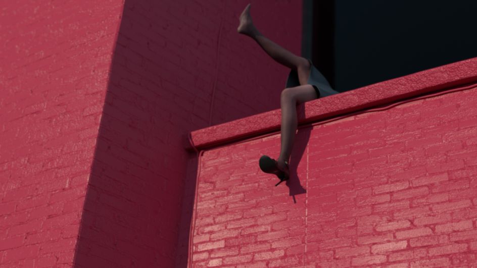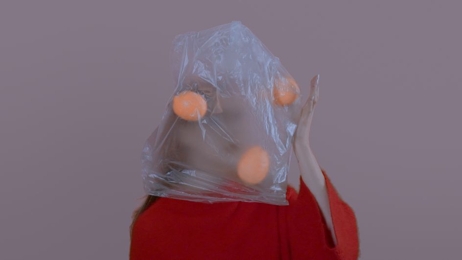With a dark and ominous soundtrack, this short features a model surrounded by various props – a bag full of oranges, a hanging brick, a plastic glove – mostly set against a bright red background.