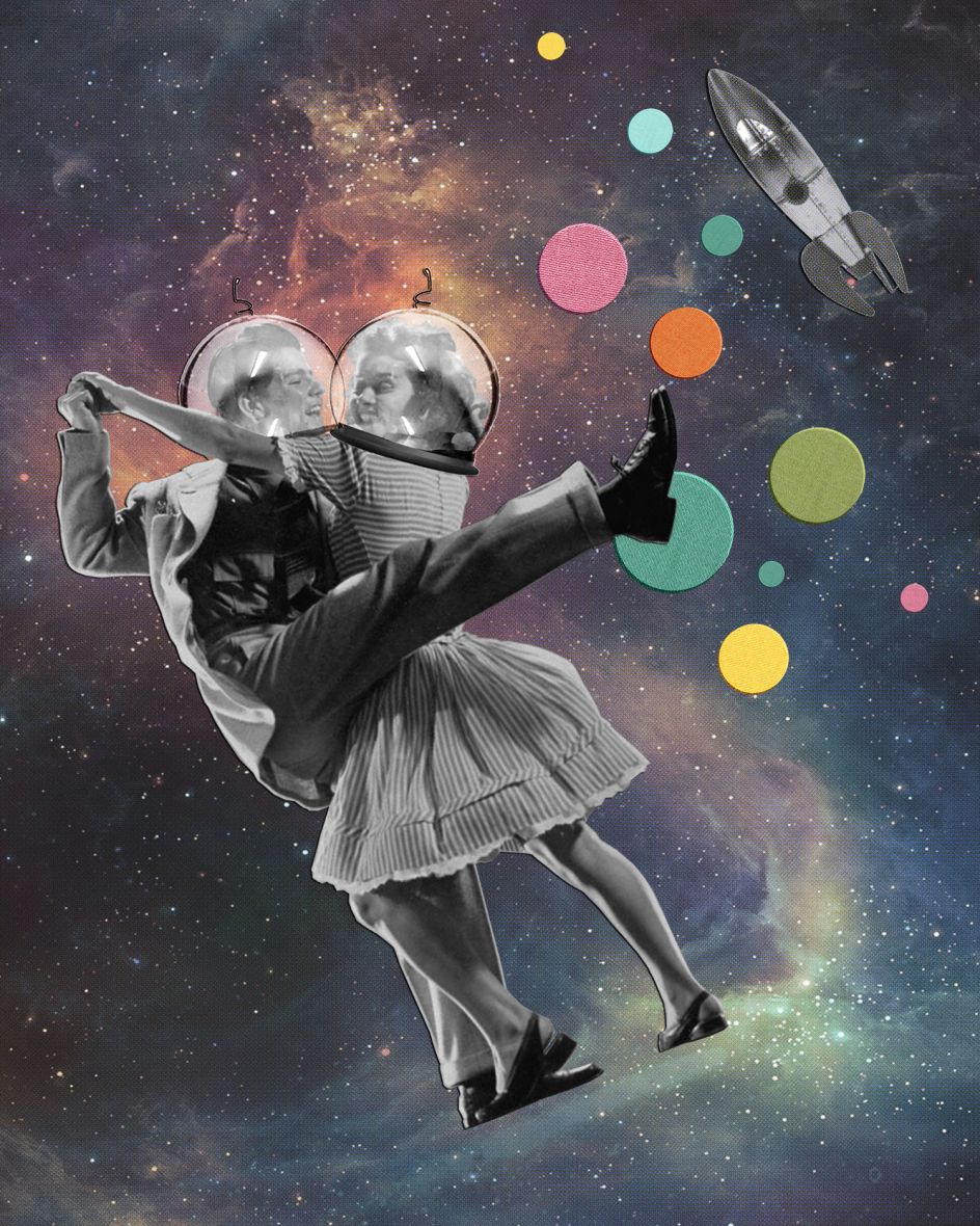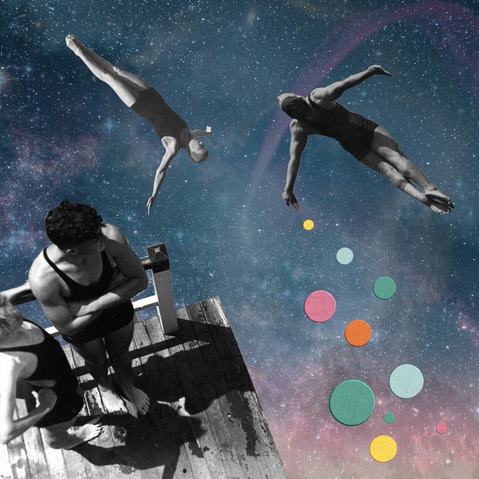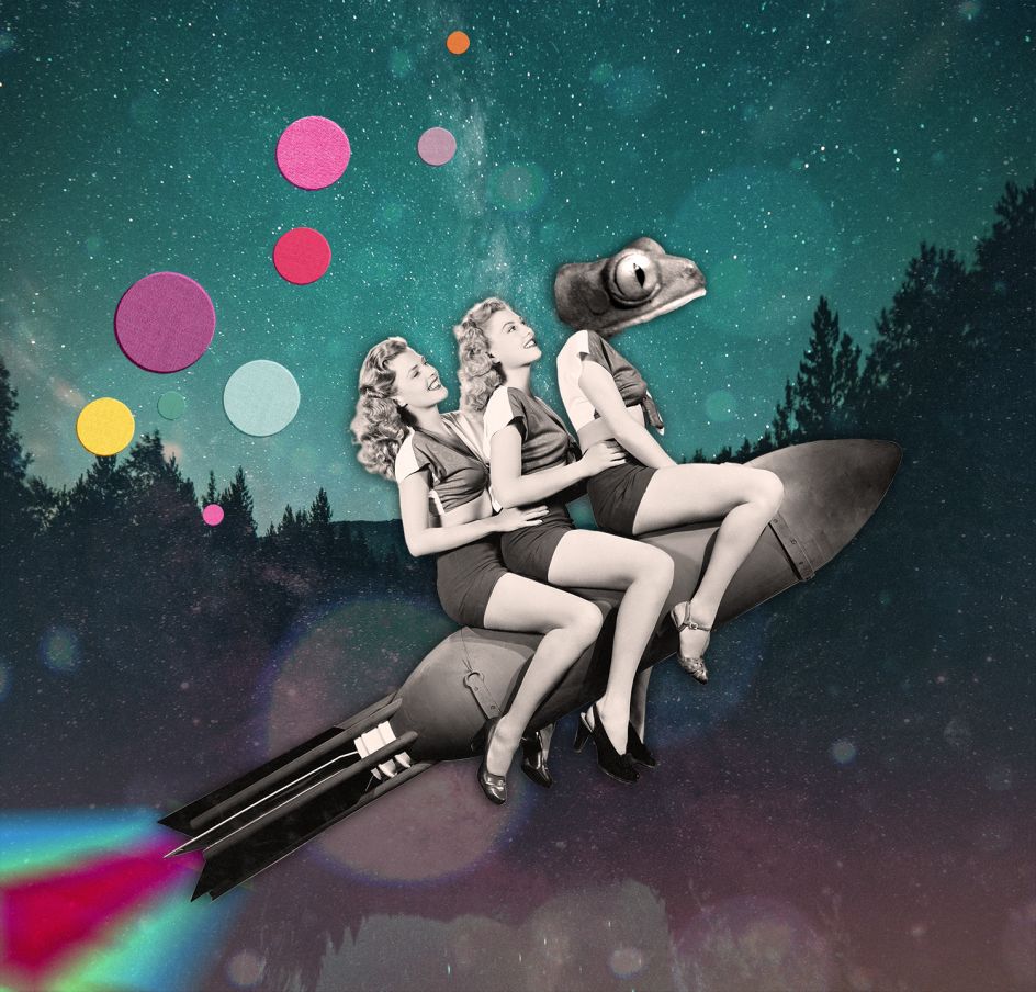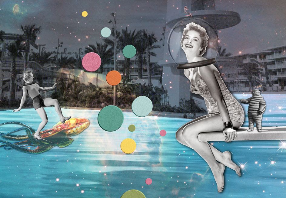 Some of These Days features artworks made up of found images from the past and paint a happier future – one perhaps imagined from the past. "So much of today's fiction about the future is a pessimistic dystopian vision, it's post-apocalyptic, zombie-ridden, natural disaster or a pandemic," says Joe of his work. "I wanted to create images that were an antidote to this gloomy perspective. An idea of the future, from a nostalgic perspective of the past, where it looked exotic and exciting – full of possibilities, where people looked happy."