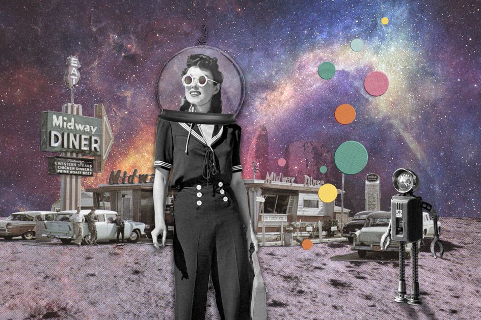 Joe created these collages inspired by pulp science fiction and romanticism. He's also referenced Hopperesque iconography that permeates much of his work - with hotels, drive-in theatres, ticket booths and diners. "Despite my best efforts, I think there's still some sinister undertones in the series, in the form of giant monsters, a reoccurring motif of jellyfish and emotionless dead-eyed robots – but hopefully the project still feels hopeful," he adds.