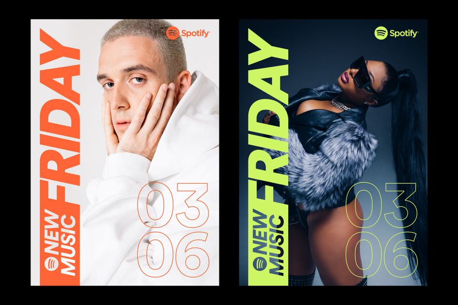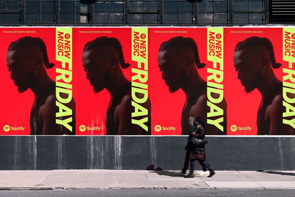 The marketing for New Music Friday, meanwhile, "truly happens in all channels", so Spotify has created layouts that function well in OOH, social, artist-generated social, and on its own platform. The launch campaign included placements around New York City, Los Angeles and Toronto.