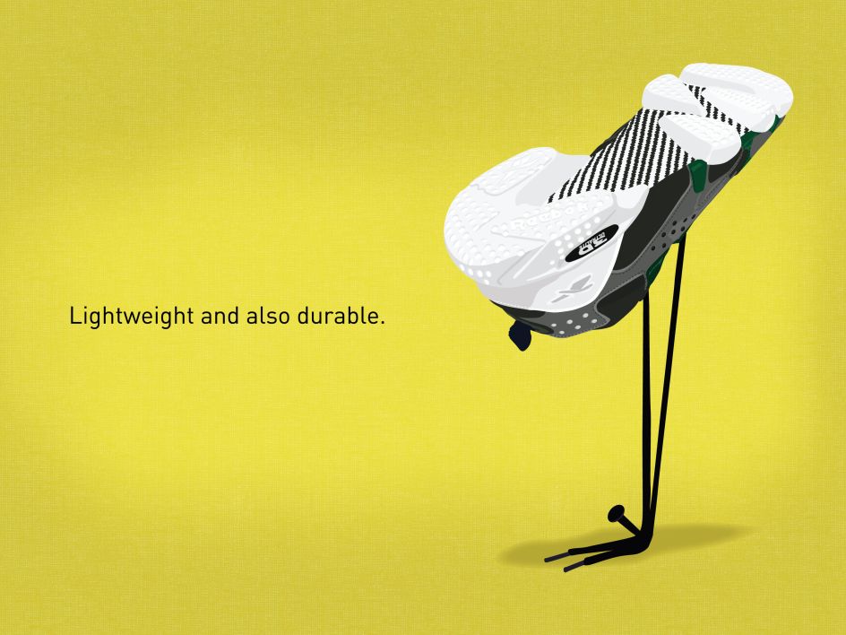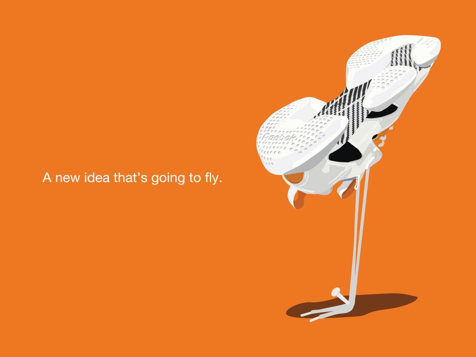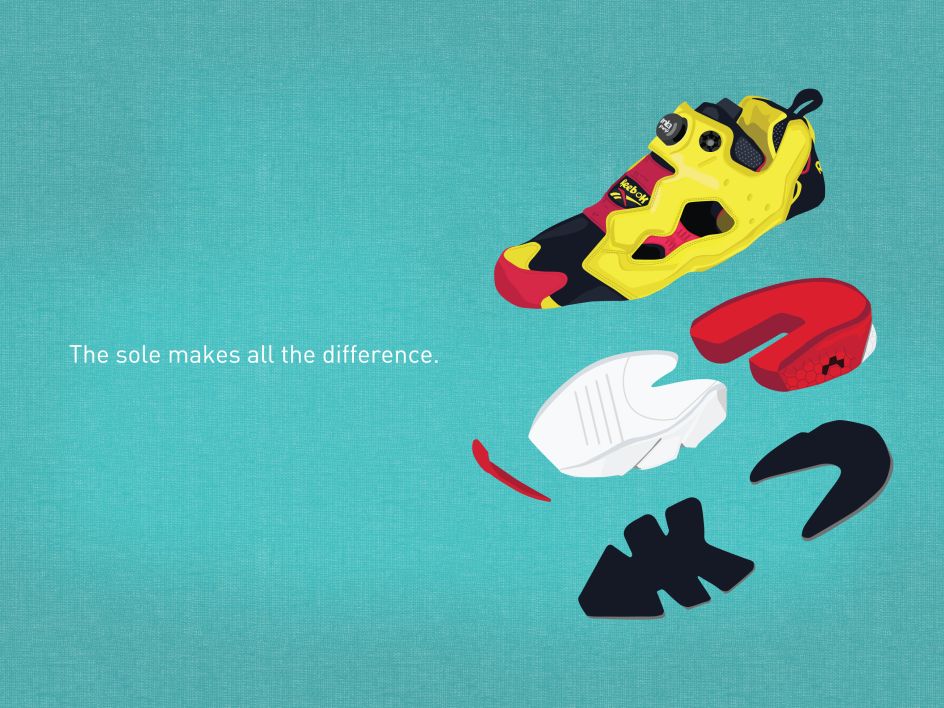 The illustrations of six pairs of sneakers, classified into two categories - the original line and the modern line - feature photo-realistic detailed vector graphics and bold-coloured backgrounds. The designs are on show at the Reebok Classic Store, Hong Kong, to celebrate the launch of a new range of sneakers with split cushioning.