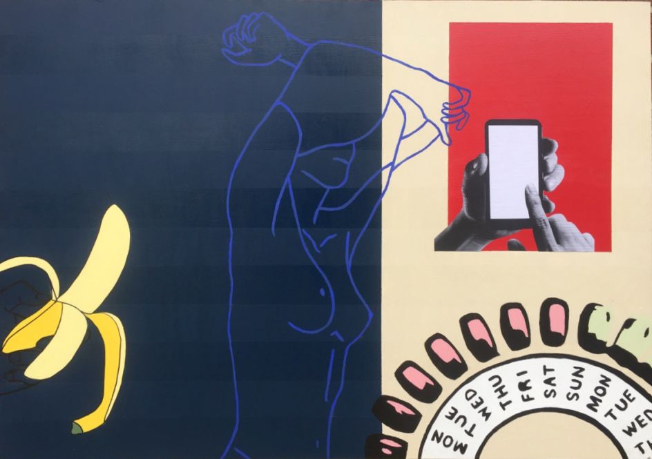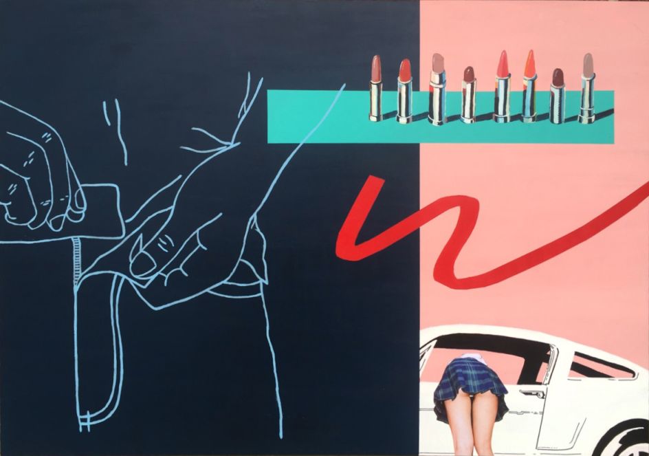 The artist uses symbols such as cars and tools to poke fun at what it means to 'be a man'. Faceless female figures appear to be shameful of their exposed bodies, but at the same time seem oblivious to the viewer's gaze.