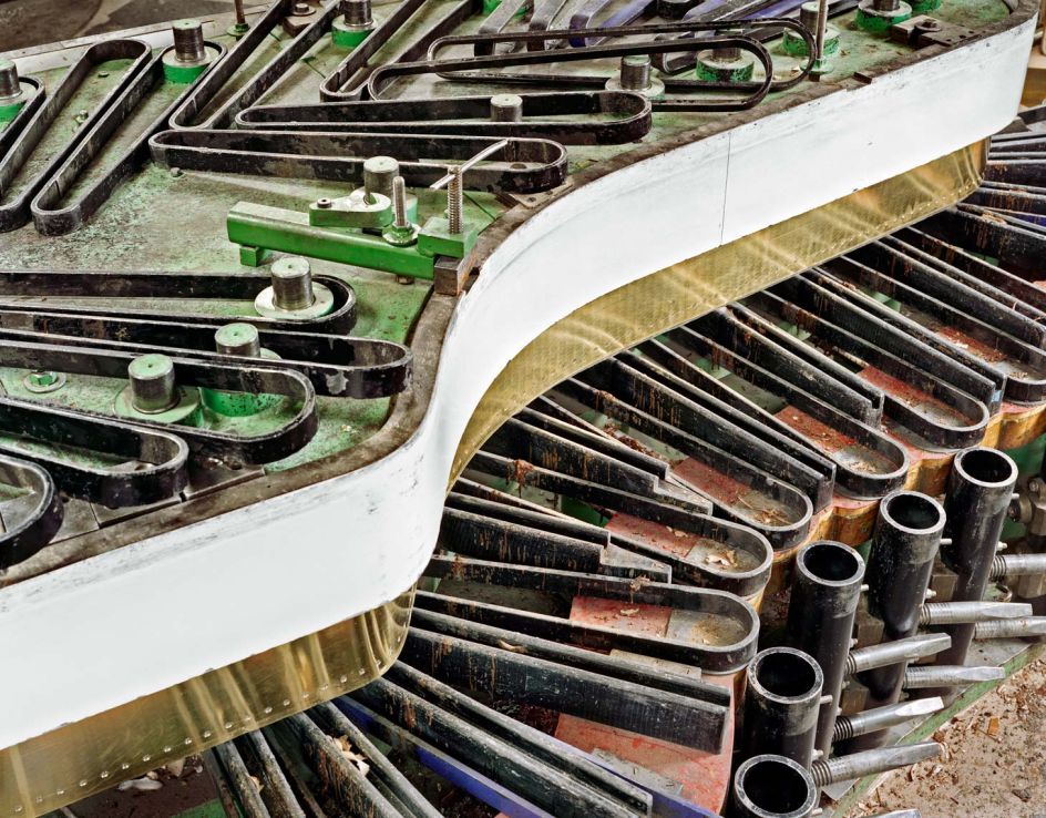 "The piano is something we all know and love as a whole; its deceptively simple, iconic form is instantly recognisable. But my photographs look in a different direction: a deconstruction of the piano’s unseen constituent parts and a glimpse into the skilled labour required to make them. While my architectural training helped me to understand how the piano works on a technical level, it remains even more of a mystery to me now than it was before. After spending countless hours photographing the choreographies of production and scrutinising the parts and pieces that will never be visible outside the factory, I came to realise that a piano is one of the supreme acts of human invention and imagination."