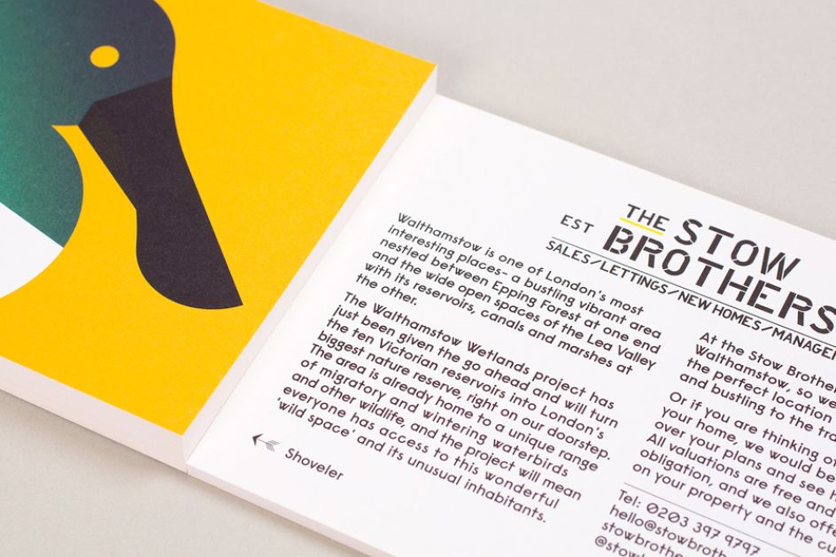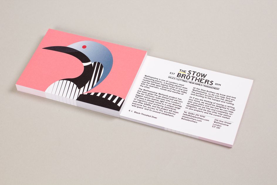 This direct mail campaign with bespoke illustrations was created by London design studio Build for the Stow Brothers, Walthamstow’s premium estate agent, and aims to promote the new Walthamstow Wetlands Project.