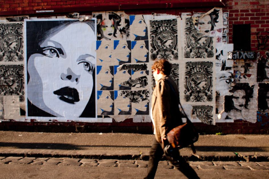 A key individual in the Melbourne street art scene, Rone’s images have not only appeared all over his city itself but have increasingly began to appear all around the world too, his trademark figures, his heroic, alluring, cinematic icons manifesting themselves in ever larger, more elaborate and emotive forms. Find out more at r-o-n-e.com.