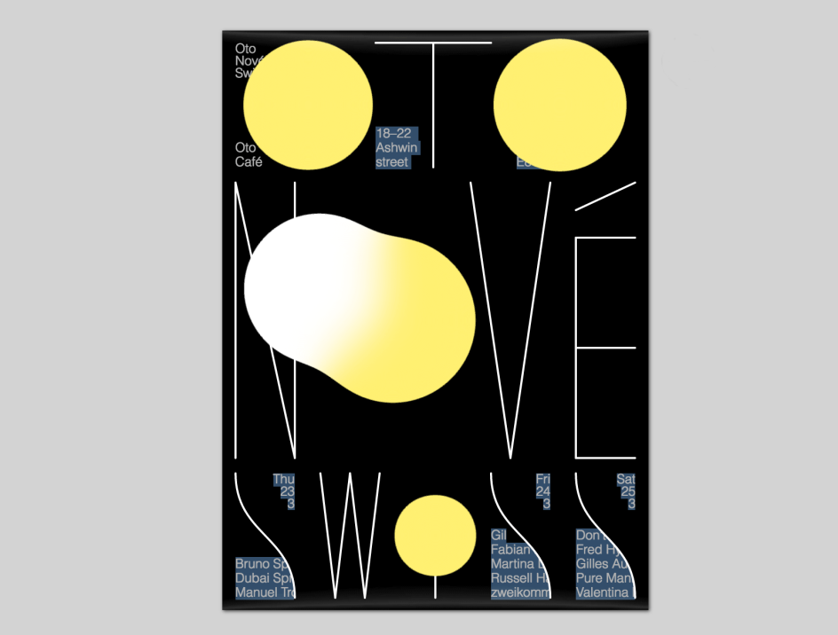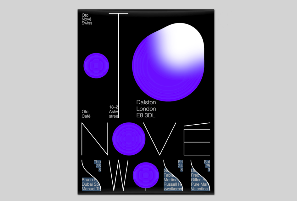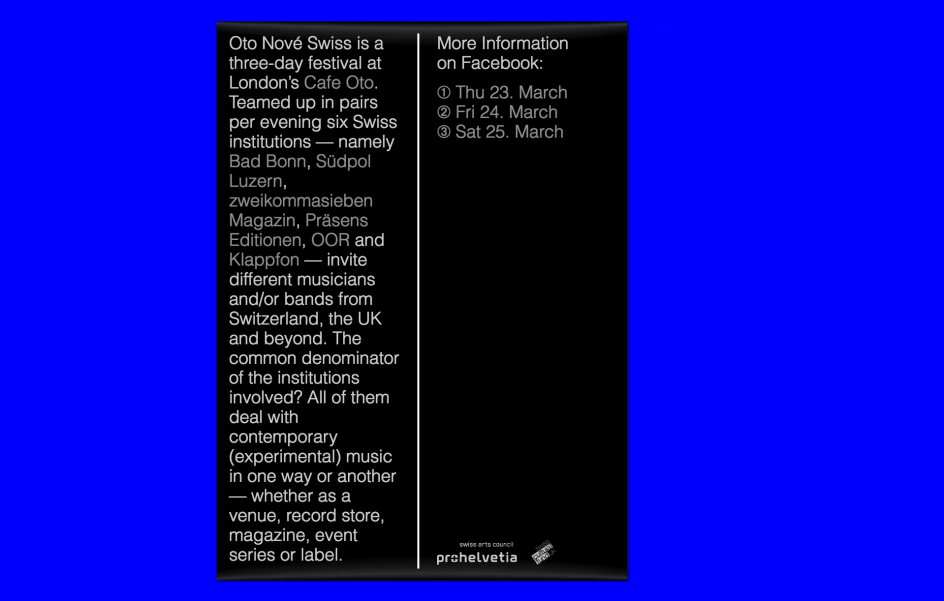 Studio Feixen, which hails from Lausanne in Switzerland, has created a concept rather unlike any we’ve seen before for the venue’s three day Oto Nové Swiss festival, designing an interactive poster that manages to look just as great as a still image as it does when in its moving, digital form. “We were asked to design whatever we think suits this event,” says Studio Feixen. “Since this festival is organized by Swiss cultural institutes but happens in London we thought it doesn’t make sense to advertise it in the streets of London but in the only place we all share. So we decided to design an interactive poster which you can explore, play around with and maybe even compose your own music.”